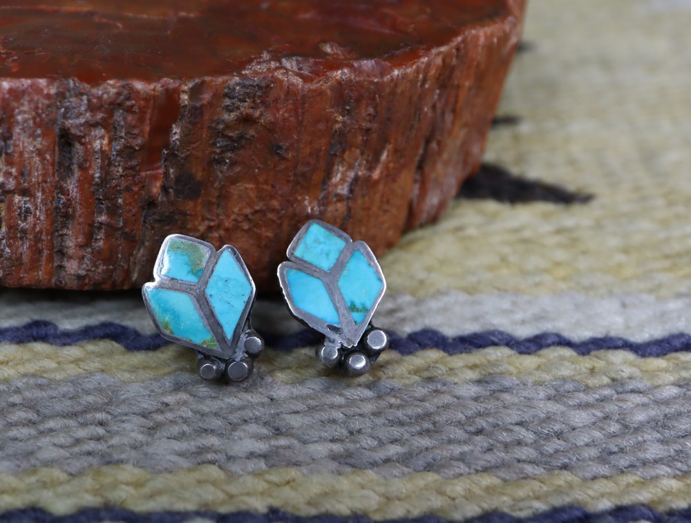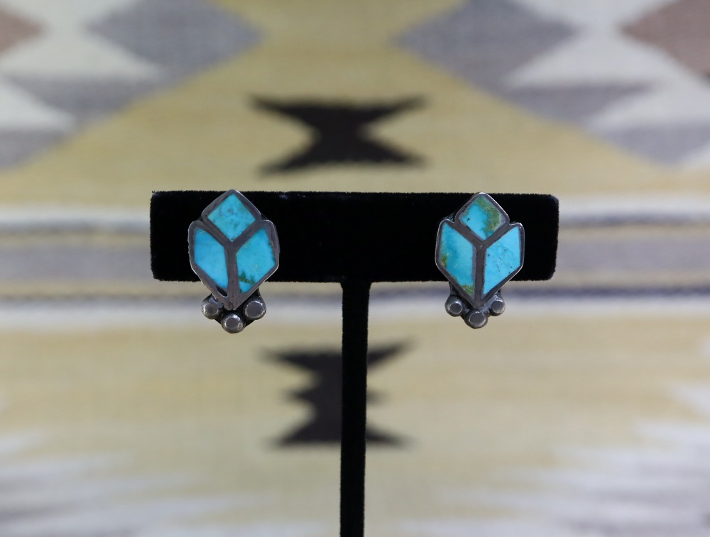 【ZUNI】ズ二のビンテージジュエリー、美しいターコイズインレイ技法をメインに構成された作品。モダンな印象にデザインされたフローラルモチーフが特徴的なスクリューバックタイプのアンティーク/ビンテージイヤリングです。