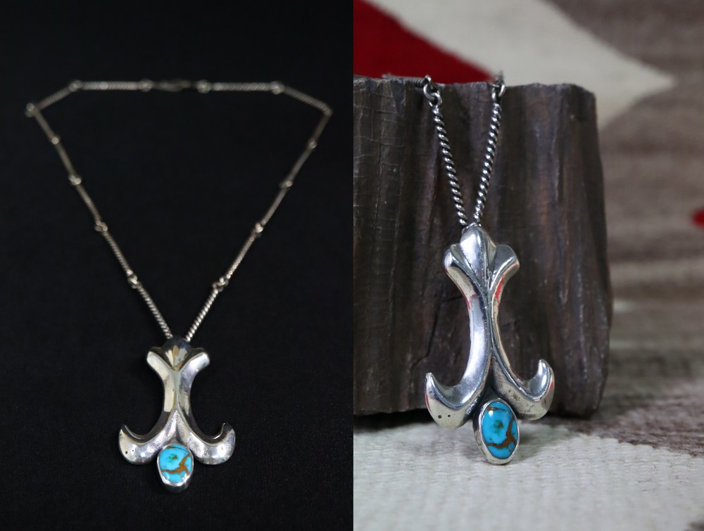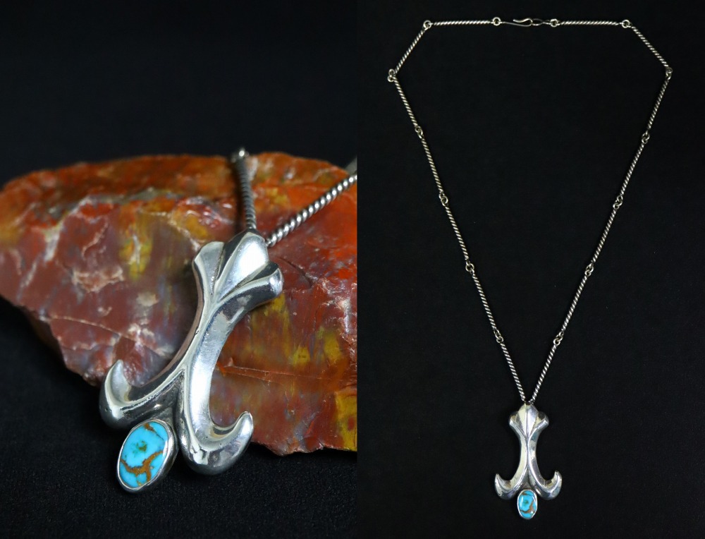 立体的に造形された百合の紋章の様なシェイプをベースに、美しいターコイズがマウントされており、程よいサイズ感と重厚な造作により上質なターコイズを引き立てながら、バランスが良くハイエンドな雰囲気を醸すネックレスとなっています。