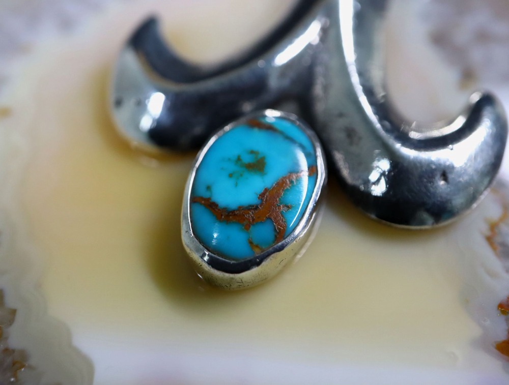 マウントされたターコイズについては、明確に鉱山を特定することは困難ですが、強い発色を持つロイヤルブルーのグラデーションをベースに、チョコブラウンのマトリックスが入り、素晴らしい透明感が特徴的な石です。
