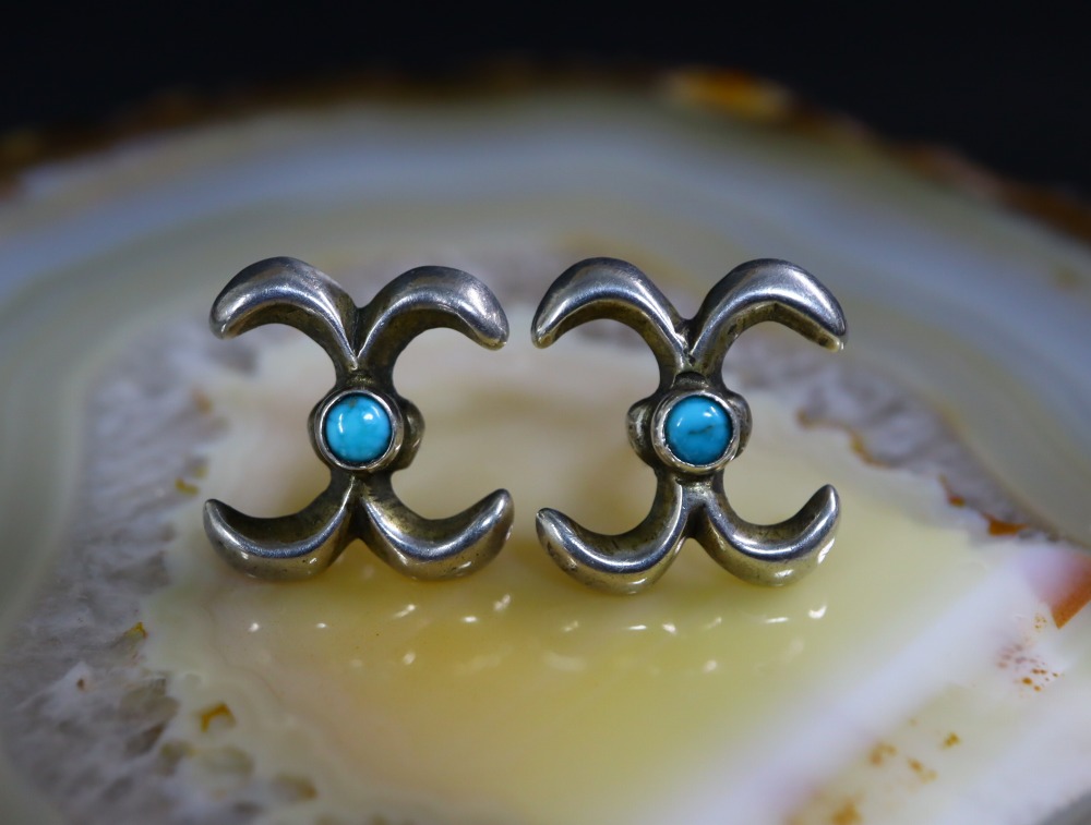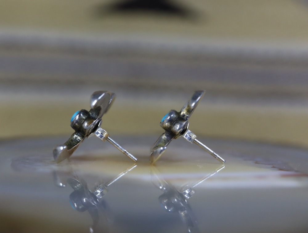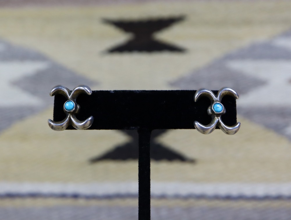 【NAVAJO】ナバホのビンテージジュエリー、サンドキャストで成形されたエスニシティでシンプルなシェイプと綺麗なラウンドカットターコイズが魅力的なアンティーク/ビンテージピアスです。