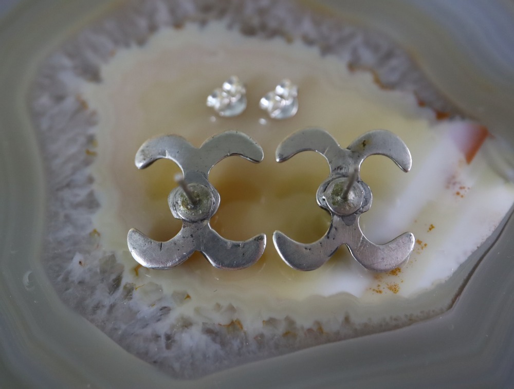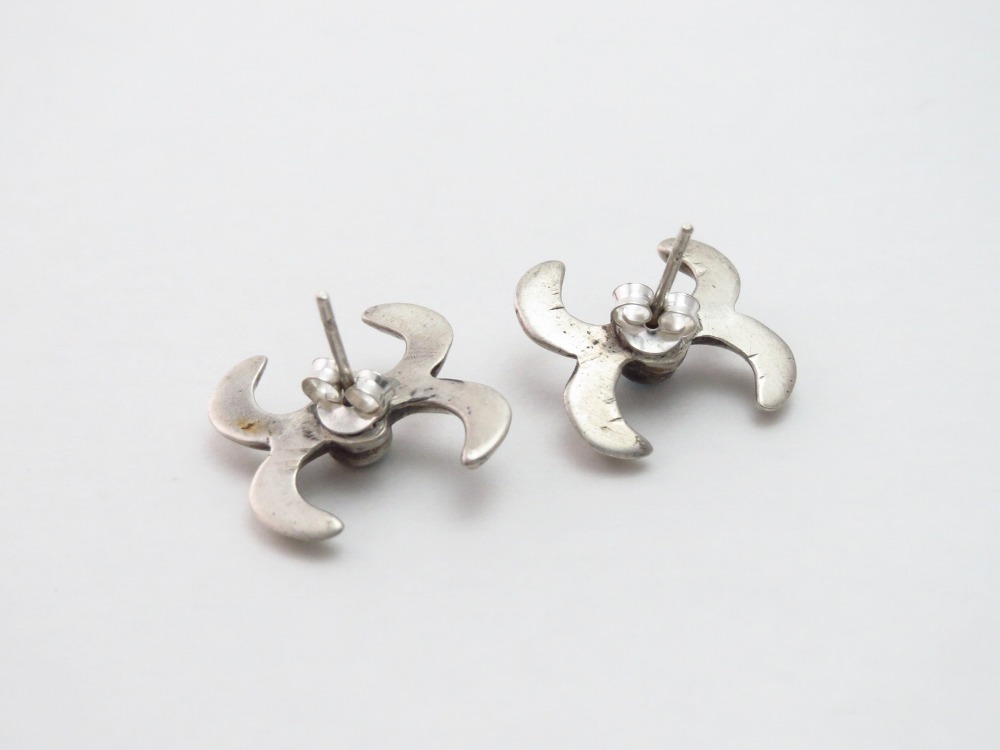 イヤリング(耳飾り)の中でも『ピアス』というアイテムは、1960年代以降に普及したジュエリーの形態です。本作の作られた正確な年代は不明ですが、シルバーワークとしては1950年代~1960年代に作られた作品と推測され、元々はスクリューバックタイプのイヤリングだったものを1970年代以降にピアスへとカスタム/リフォームした可能性もある作品です。