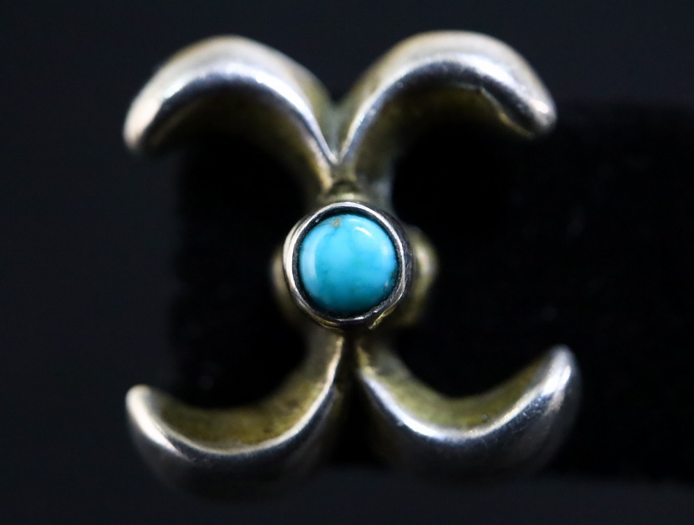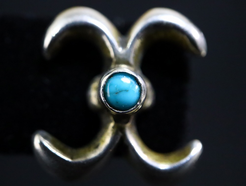 サンドキャスト(砂型鋳物)によってナジャを2つ併せた様なシェイプが形作られたおり、その中央に小さなラウンドカットターコイズがマウントされています。