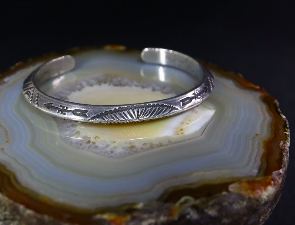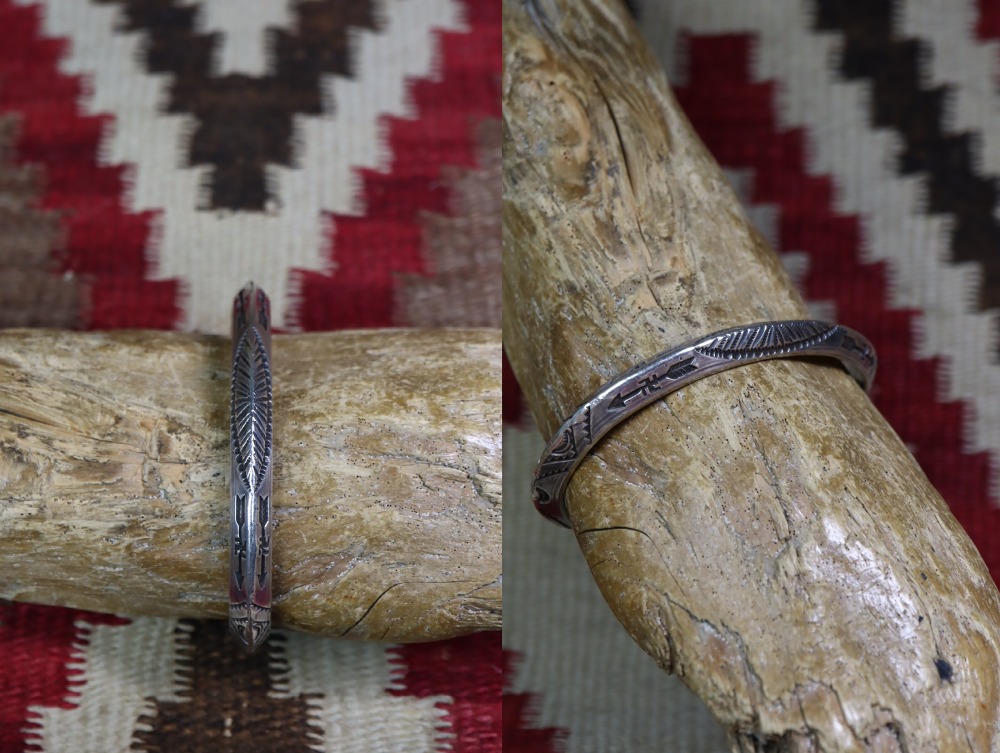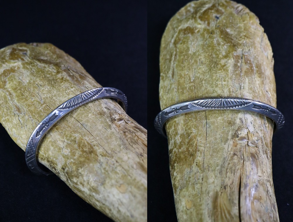 【NAVAJO】ナバホのアンティークジュエリー、インゴットシルバー(銀塊)から成形された非常に重厚なトライアングルワイヤー(竜骨型)のバンドのフロント部分にバーストデザインが構成され、【卍】Whirling Log/Nohokos等のスタンプワークが刻まれたアンティーク/ビンテージバングルです。