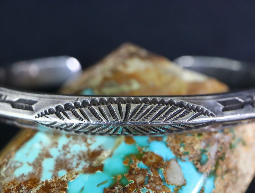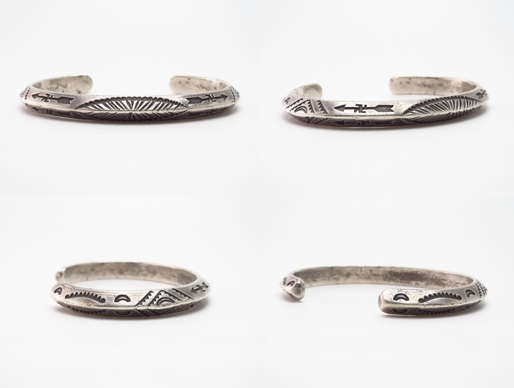 さらに、サイド~ターミナルにかけてもプリミティブな印象の力強いスタンプワークが施され、アンティークナバホジュエリーらしく武骨でエスニシティな魅力を放っています。