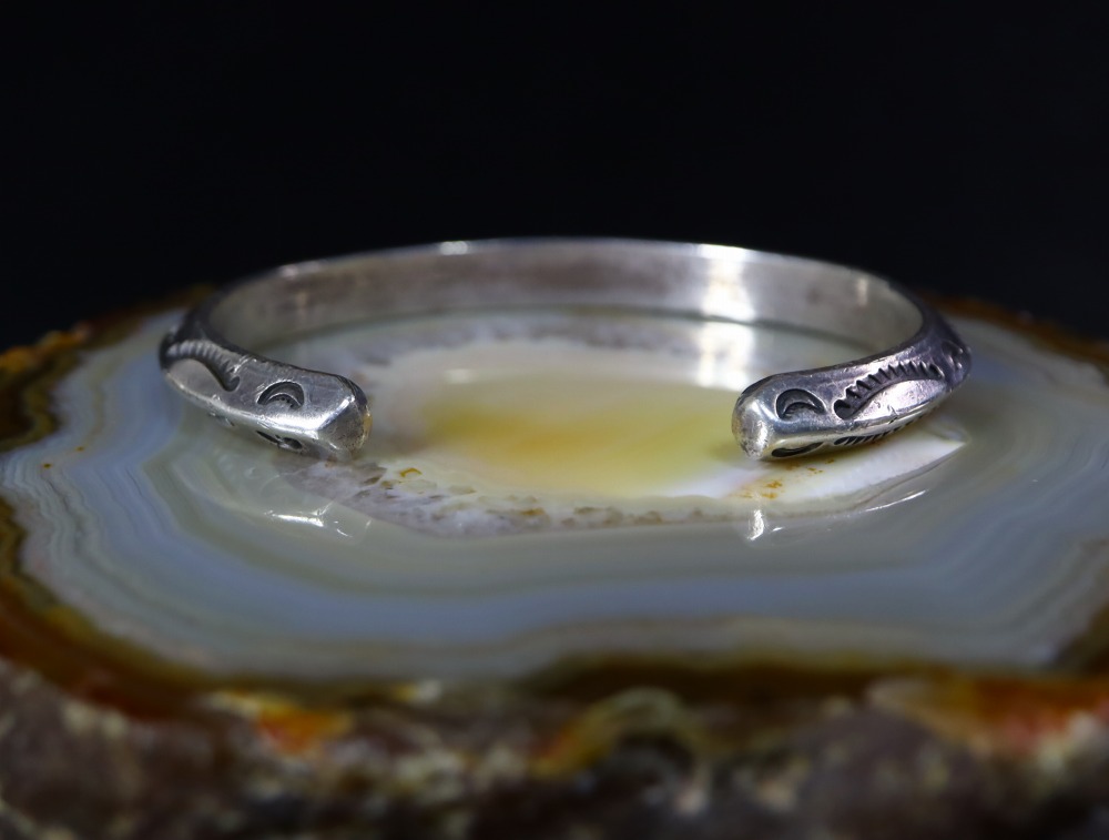 トライアングルの内側のエッジや、ターミナル(バングルの端)部分は丸く鞣され、既製のトライアングルワイヤーが使用されていない事、類似した作品が全く発見されていないこと等により、ツーリストジュエリーの中でも非常に古い作品と推測する事が出来ます。