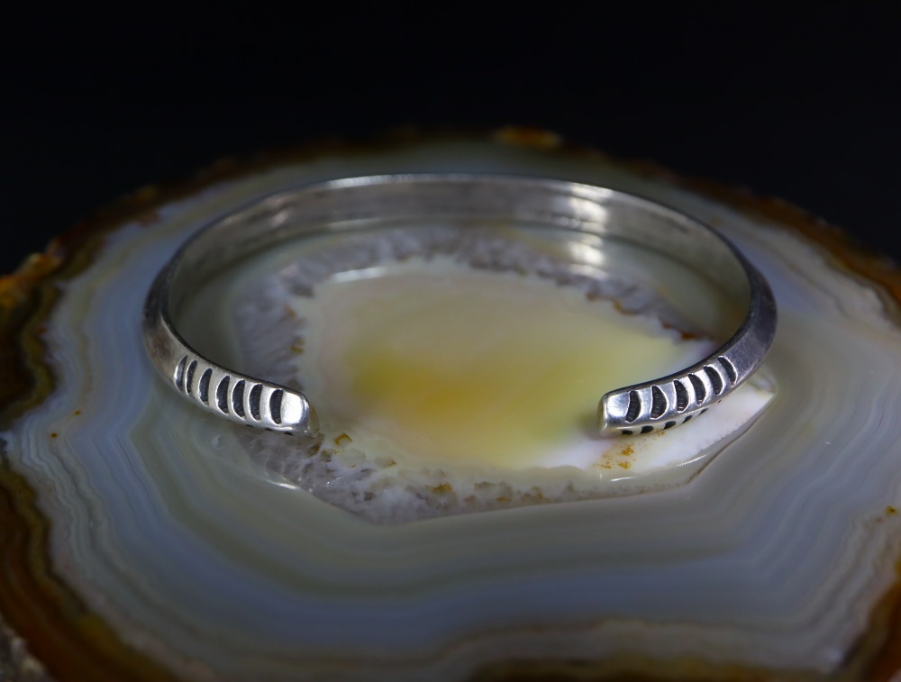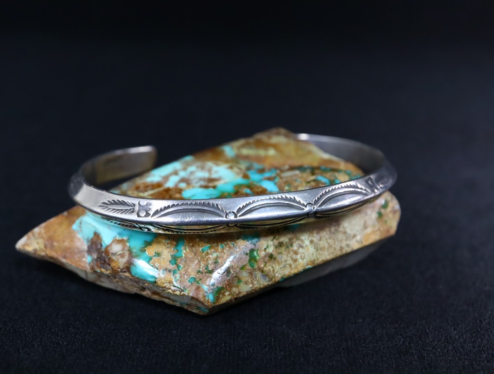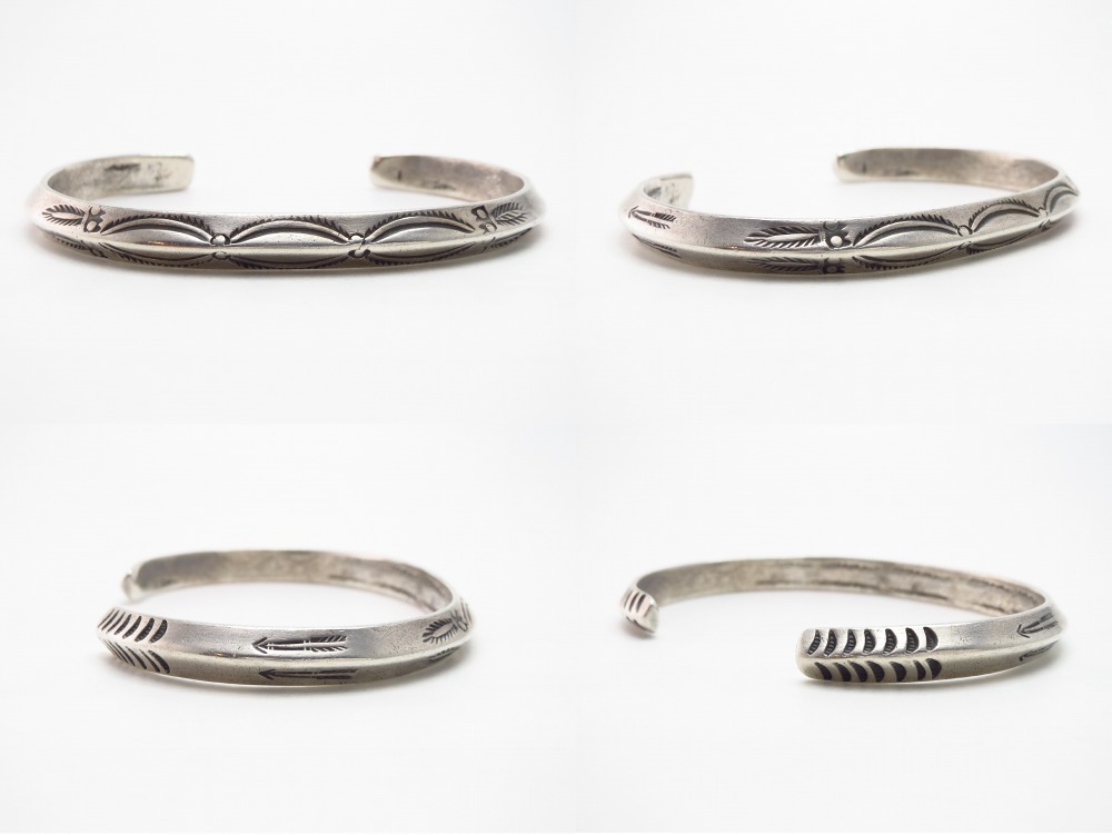 それらのプリミティブな製法と、古典期から続く伝統を継承する造形スタイルの作品であり、その製法や力強いスタンプワークによって、ビンテージインディアンジュエリーらしい武骨な雰囲気と、現代においても洗練された印象も受ける高い完成度を備えた作品です。