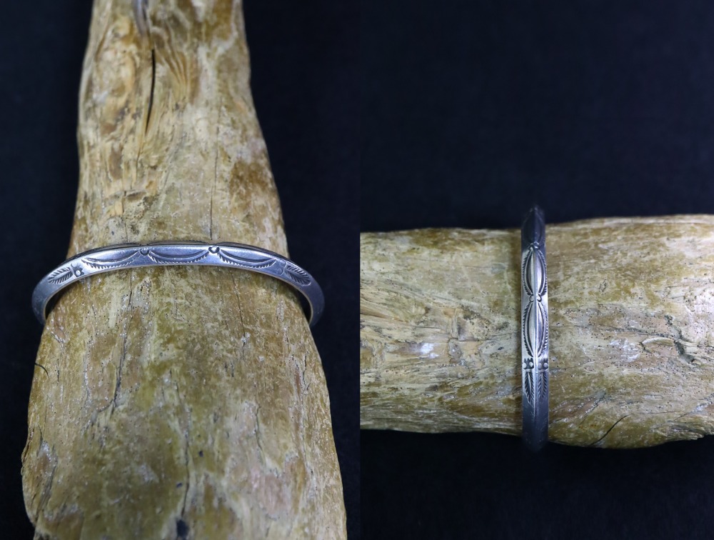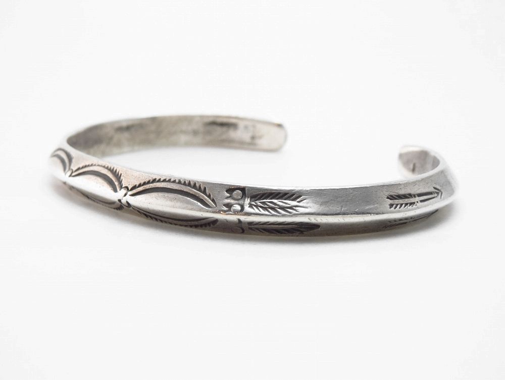 【NAVAJO】ナバホのアンティークジュエリー、インゴットシルバー(銀塊)からハンマーワークによって成形されたトライアングルワイヤー(竜骨型)をベースに、インディアンジュエリーにおける最古のモチーフの一つであるアローや、愛らしい印象の梟/フクロウ等、プリミティブで力強いスタンプワークが刻まれたアンティーク/ビンテージバングルです。