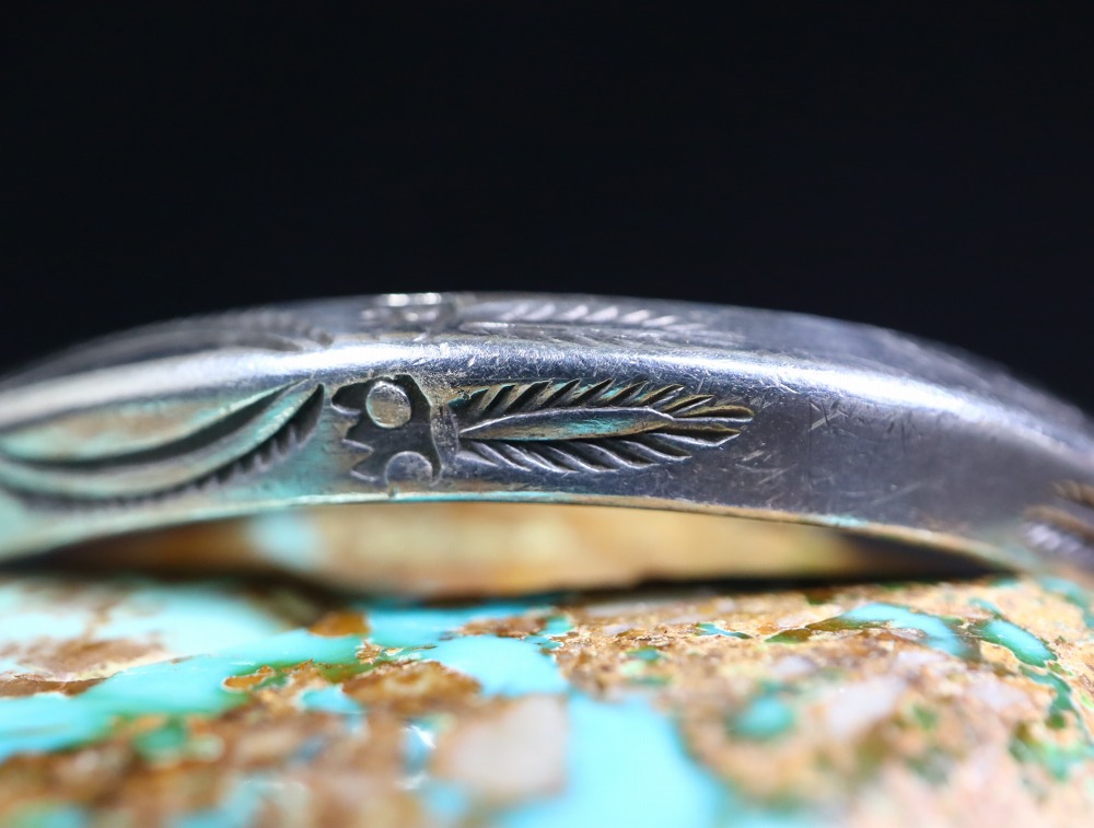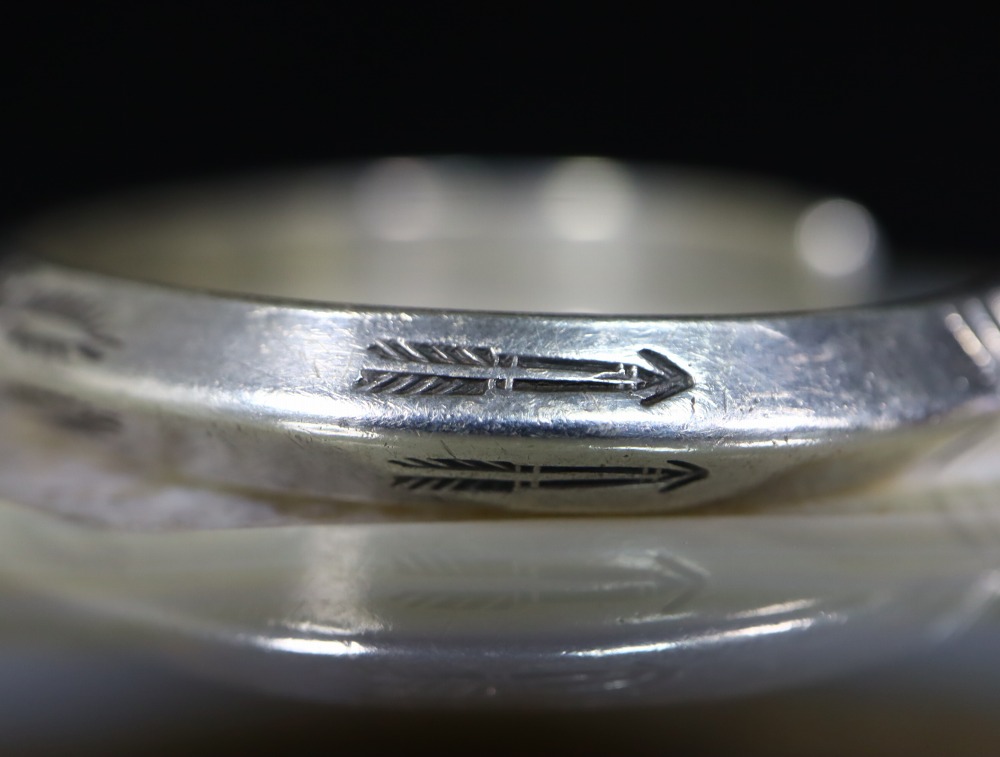 さらに両サイド部分に施された、小さくも秀逸なクオリティのスタンプツール(鏨・刻印)による、アローモチーフもインディアンジュエリーらしい魅力を与えています。