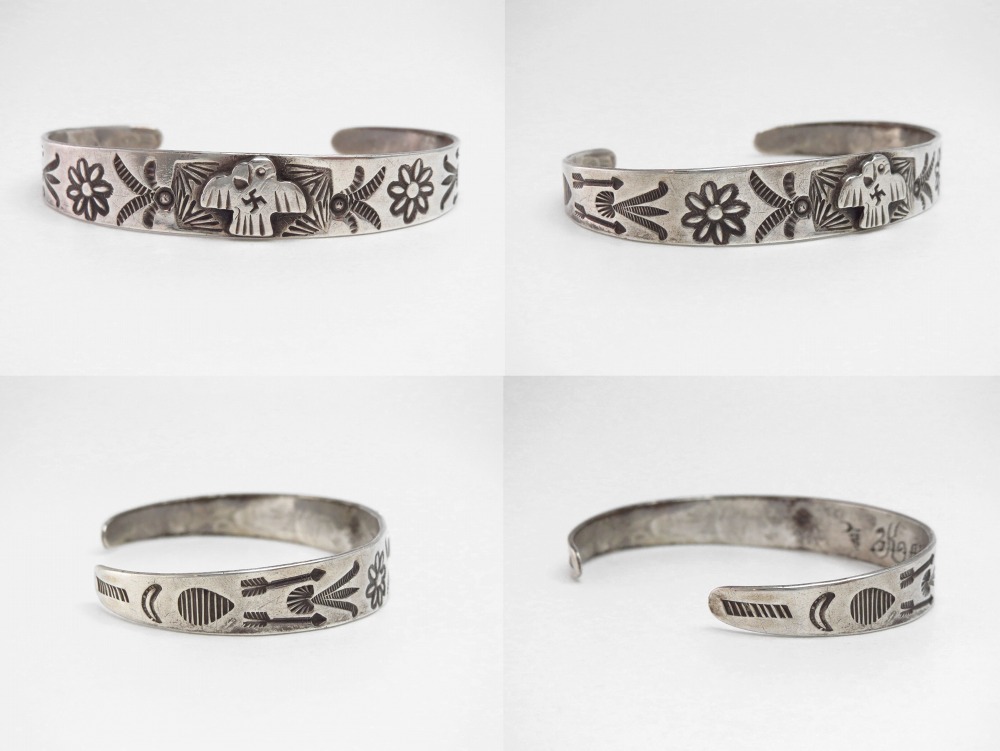 【NAVAJO】ナバホのアンティークジュエリー、程よいボリューム感のバンドをベースに【逆卍】Whirling Log/Nohokosのスタンプワークが刻まれたどこか愛らしいサンダーバードのアップリケ/パッチワークが施された貴重なアンティーク/ビンテージバングルです。
