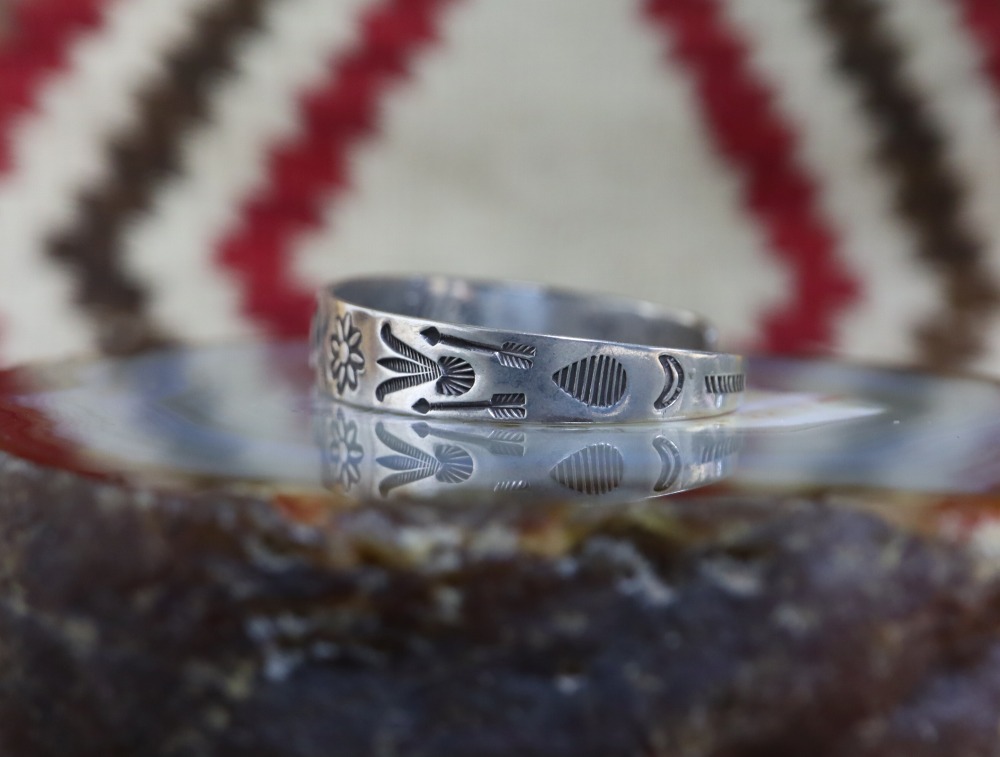 さらに、サイド~ターミナル(両端)にかけても、アローやサボテンの花をモチーフとしたデザイン等、ツーリストジュエリーらしくもプリミティブで力強いスタンプワークが刻まれており、控えめなボリューム感の作品ながら見所の多いピースです。