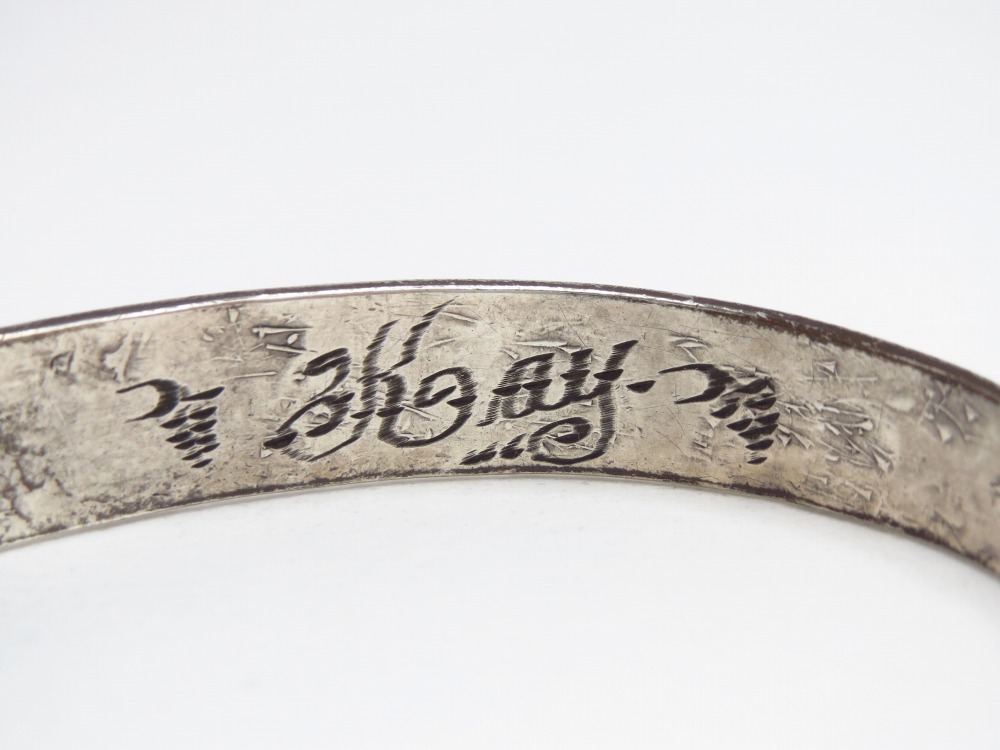 1930年代前後に作られた作品で、おそらくインゴットシルバー(銀塊)から成形されたバンドは、中央からターミナル(両端)にかけて少しづつ細くなるオーセンティックなシェイプとなっています。