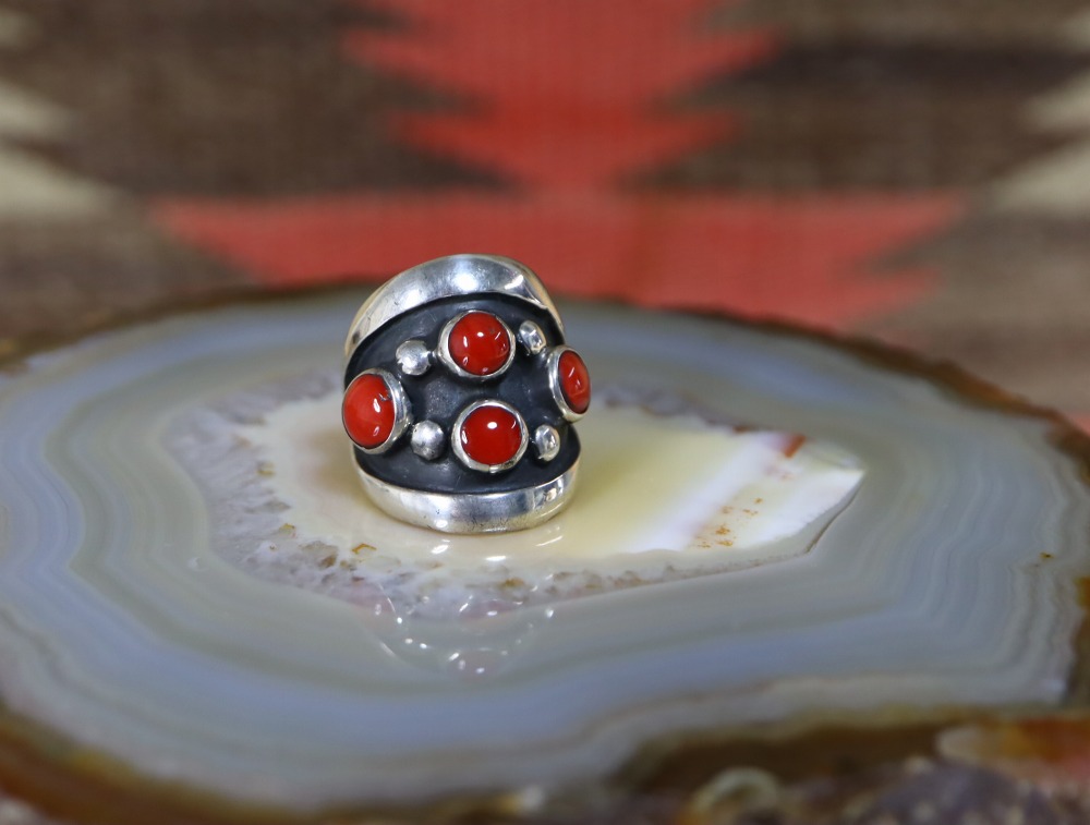 【NAVAJO】ナバホのビンテージジュエリー、クリーンで神秘的なシルバーワークをベースに、大変美しいレッドコーラル(赤珊瑚)がマウントされた作品。構造的な設計と美しいデザインを両立し、高い完成度を誇るアンティーク/ビンテージリングです。