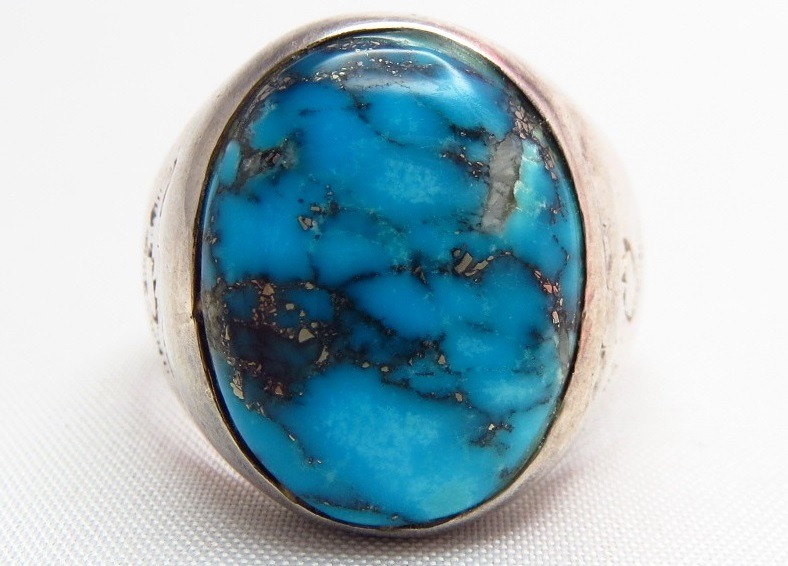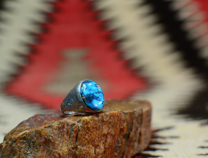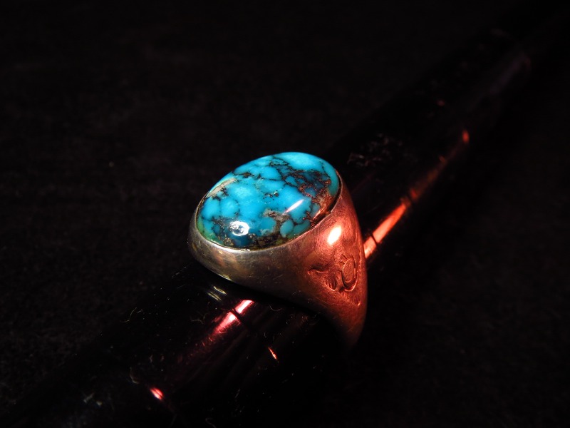 おそらくキャストで成形されたシャンクに少し存在感の薄いスタンプワークが施されています。大変シンプルなデザインで、メインとなるカボションカットターコイズの存在感と美しさを際立たせる造形の作品です。
