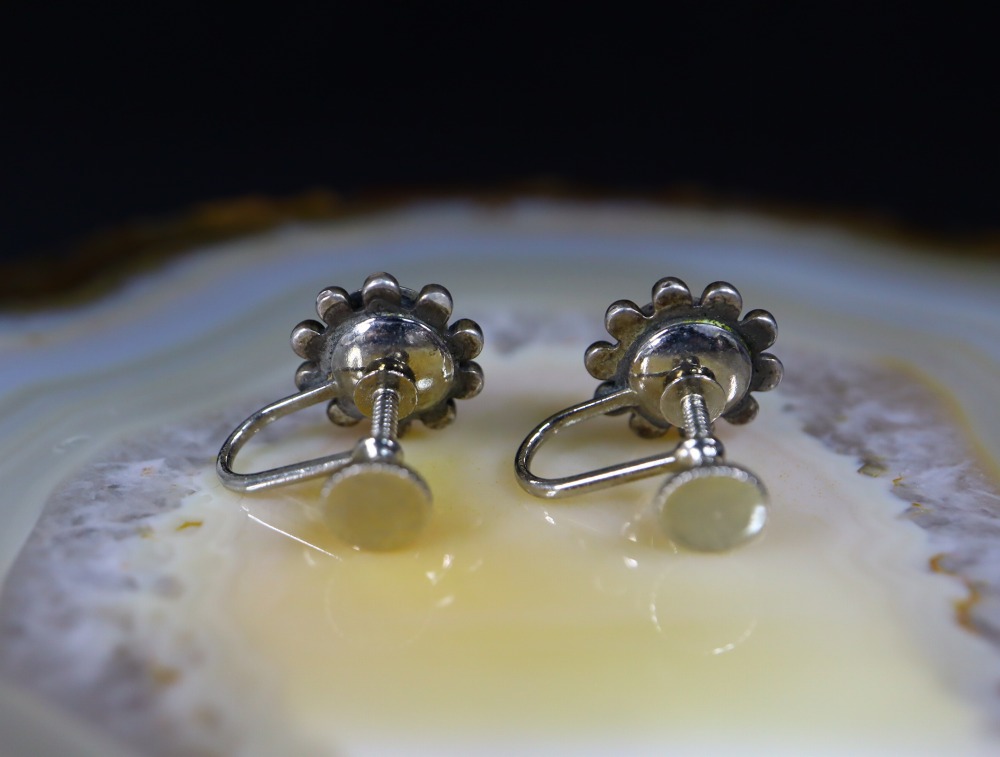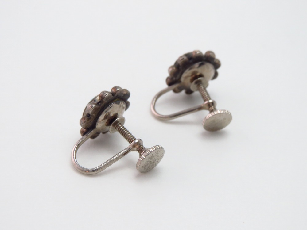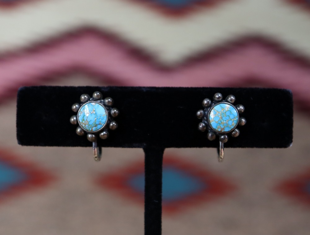 【Fred Harvey Style】フレッド・ハービースタイルや【Tourist Jewelry】ツーリストジュエリーと呼ばれる、20世紀前半頃にアメリカ中西部の観光客向けに制作されたスーベニアアイテム(土産物)の一つで、美しいブラウンウェブナンバーエイトターコイズが大変魅力的なスクリューバックタイプのアンティーク/ビンテージイヤリングです。
