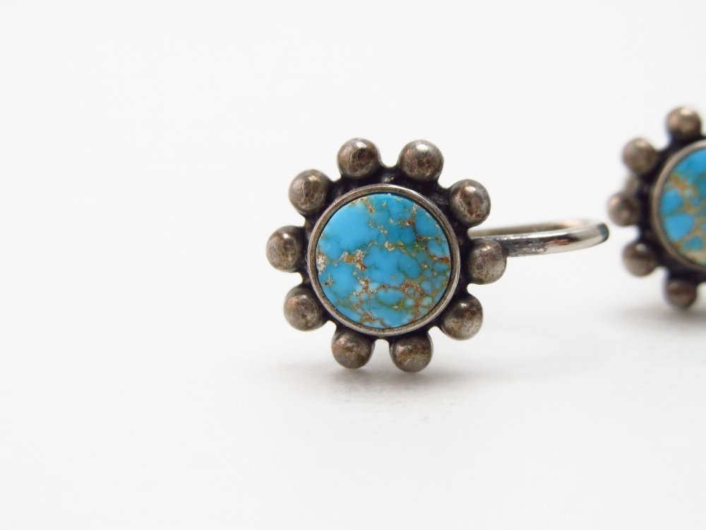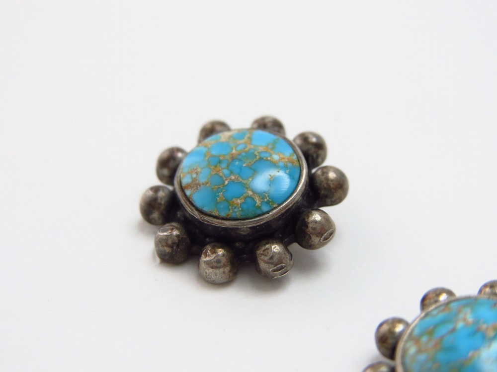 1930年代末頃~1950年代頃のピースと思われ、ターコイズの周囲をシルバーボール/シルバードロップが囲むフラワーコンチョデザイン。さり気ない造形ですが、立体的な凹凸による影と奥行きが石の色彩を際立たせています。