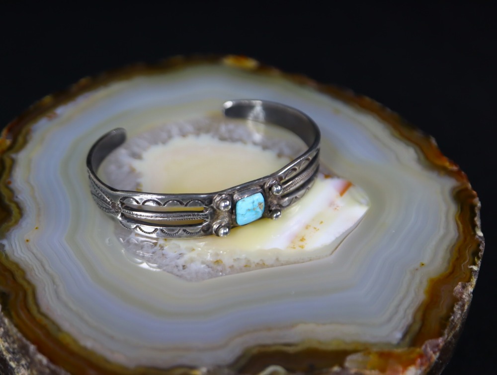 こちらの作品もシルバーの塊から原始的な技術を駆使することで作り上げられ、その他全てのディテールがナバホの伝統的な技術/技法によって造形されており、上記の様なプリミティブで手の込んだシルバーワークをベースに、美しいターコイズががマウントされる事で希少性と風格も付加されています。