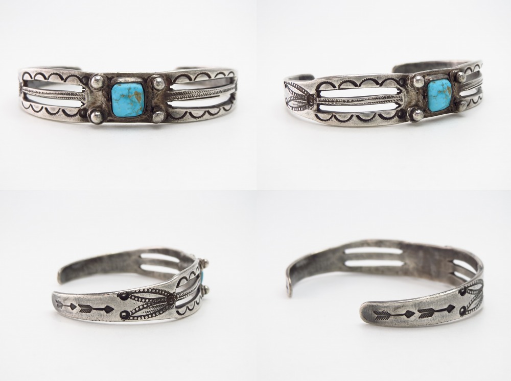 すべてのディテールがナバホのプリミティブで伝統的な技術によって造形されており、荒々しいシルバーワークの武骨な表情と、細かな装飾や上質なスタンプツールによる繊細で緻密な印象という、相反する要素を併せ持つ作品。それら異なる特徴が織り成す独特な完成度と味わいは、現代作品には無いスペシャリティを生み出しています。