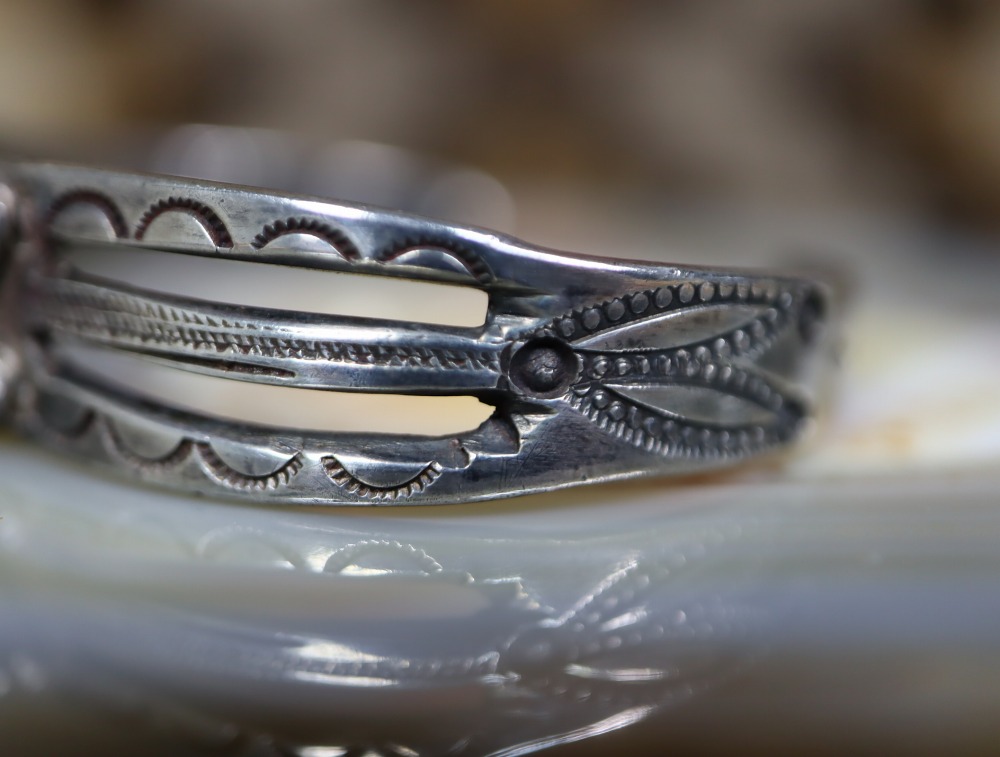 さらに、フロントからターミナル(両端)まで、スタンプワークによるナバホジュエリーらしい文様が刻み込まれていますが、そのスタンプツール(鏨・刻印)はアンティーク作品特有の上質なクオリティを誇るスタンプツールとなっています。