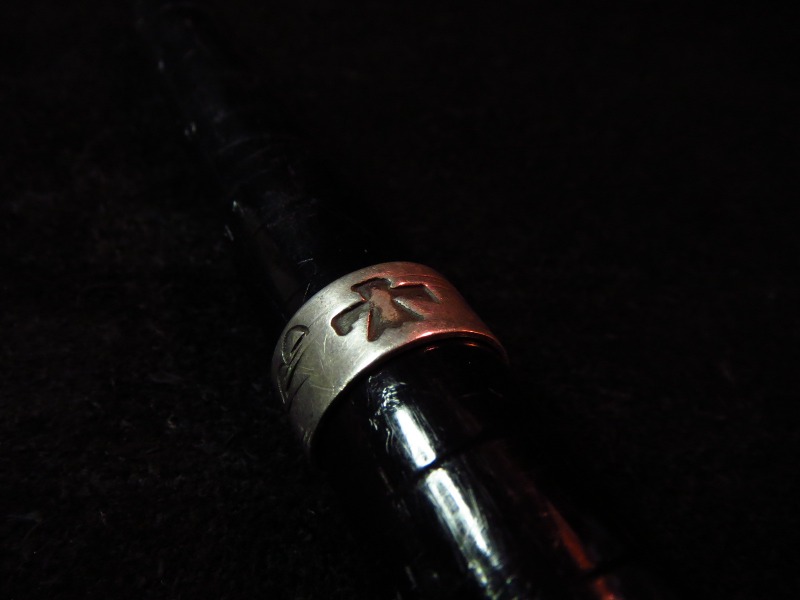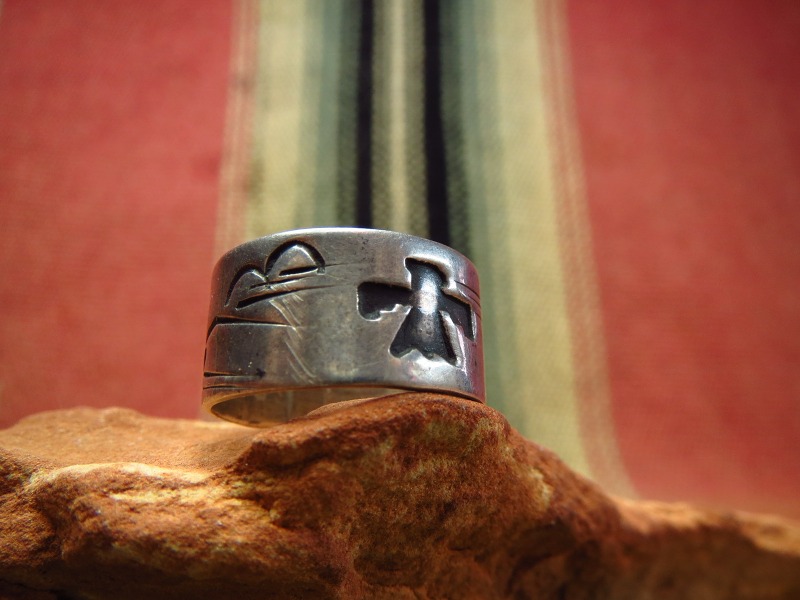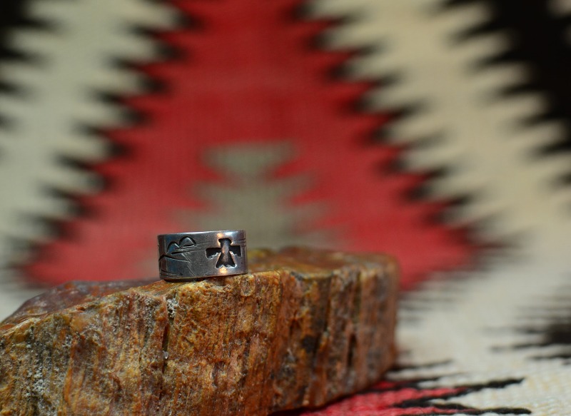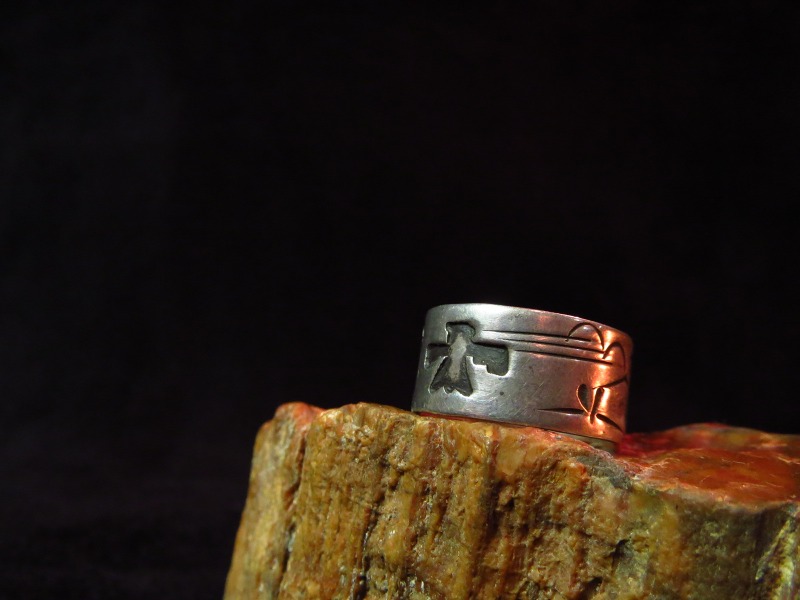 とても古い作品らしい素朴でヘリテイジ感あるデザインの作品です。程よいボリュームのシャンクに、サンダーバードとサウスウエストの景色がスタンプワークで施されています。伝統的で原始的な手法による造形、少し黒っぽいシルバーの肌等アンティーク独特の質感も堪能できる作品に仕上がっています。