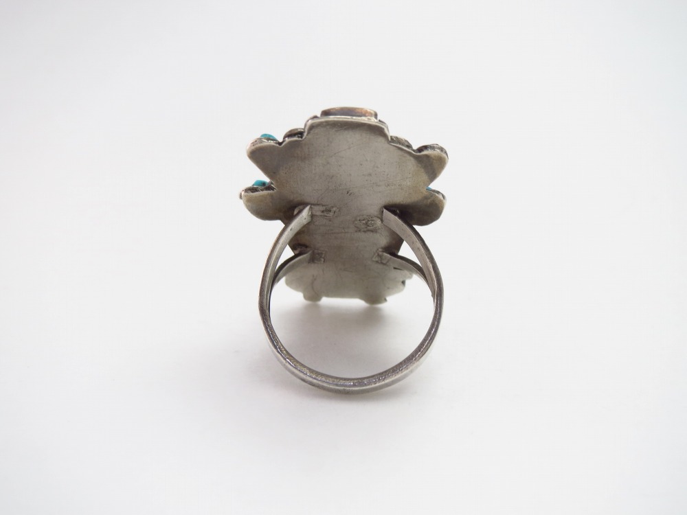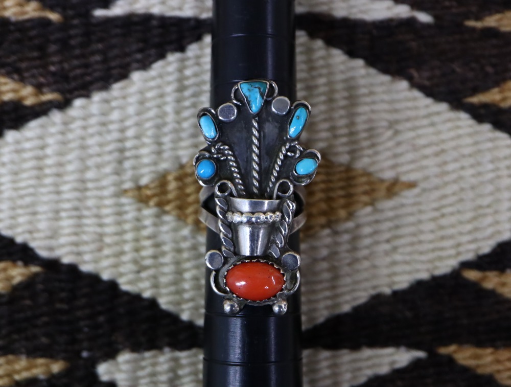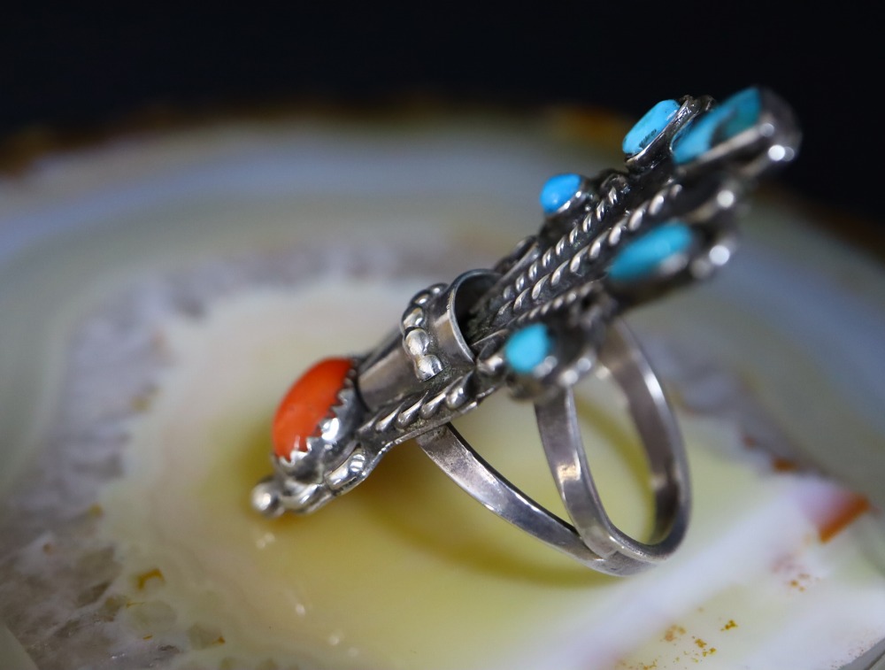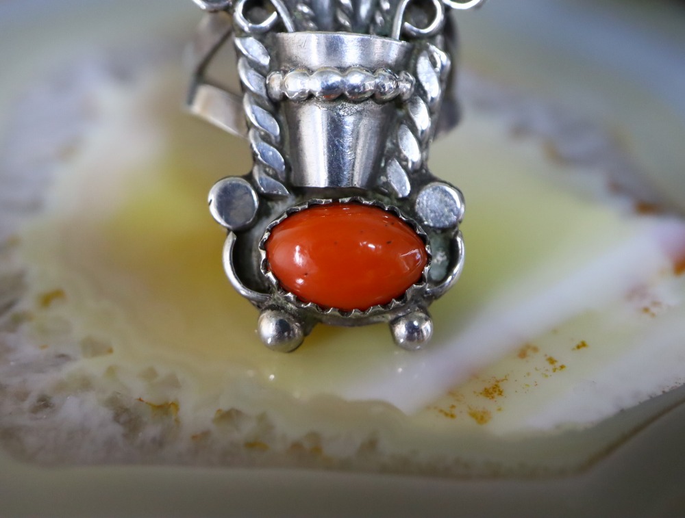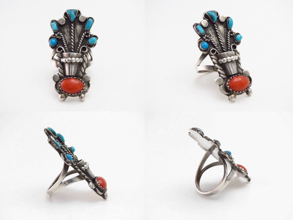 また本作は、コーラルの色彩に負けない迫力のあるボリューム感を持つリングですが、デザインのバランスやアーシーなターコイズの表情等により、素朴さや調和を感じさせる作品となっています。
