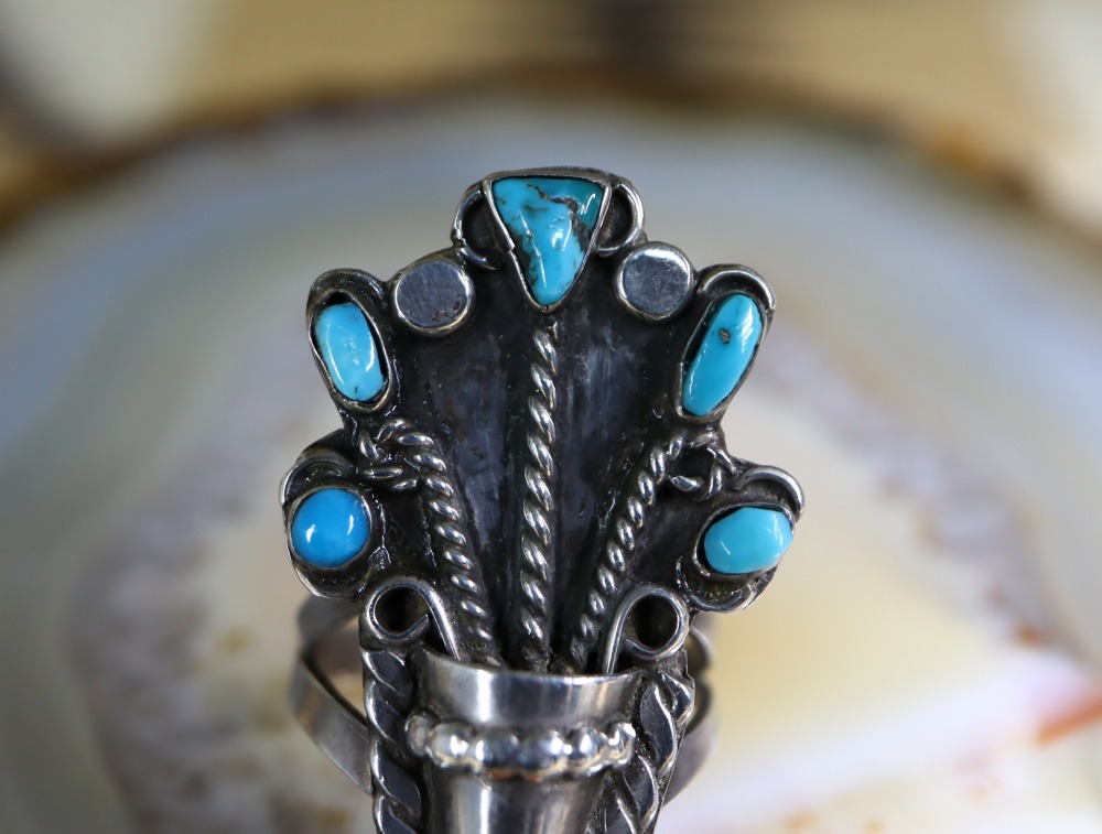 ただし、その植物の表現や複合的なシルバーワークの組み合わせからは、インディアンジュエリー史に多大な影響を与えた偉大なイタリア人作家【Frank Patania Sr.】フランク・パタニア(1899-1964)及び、同氏が1927年に創業したシルバージュエリーショップである【Thunderbird Shop】で作られたジュエリーを起源としている可能性が高いように思われます。