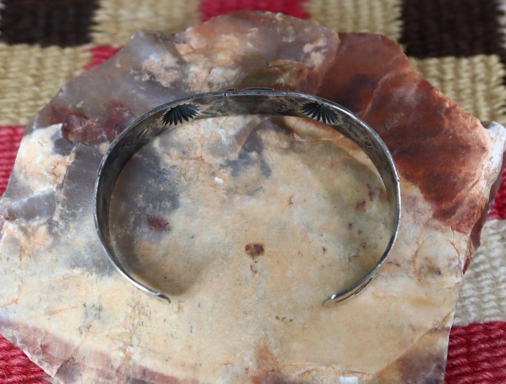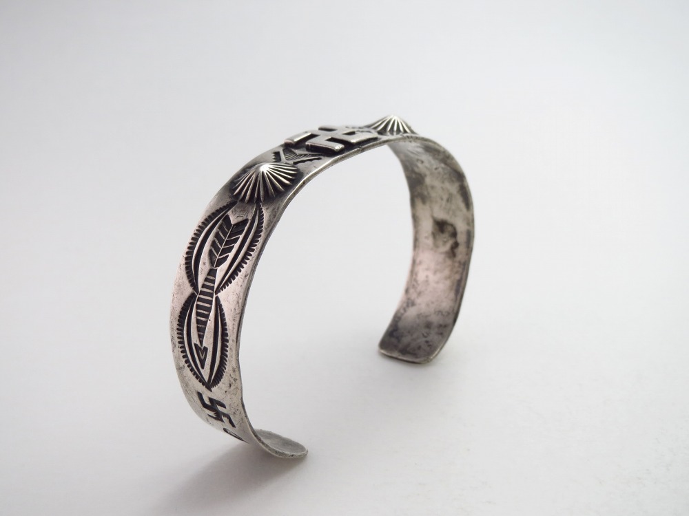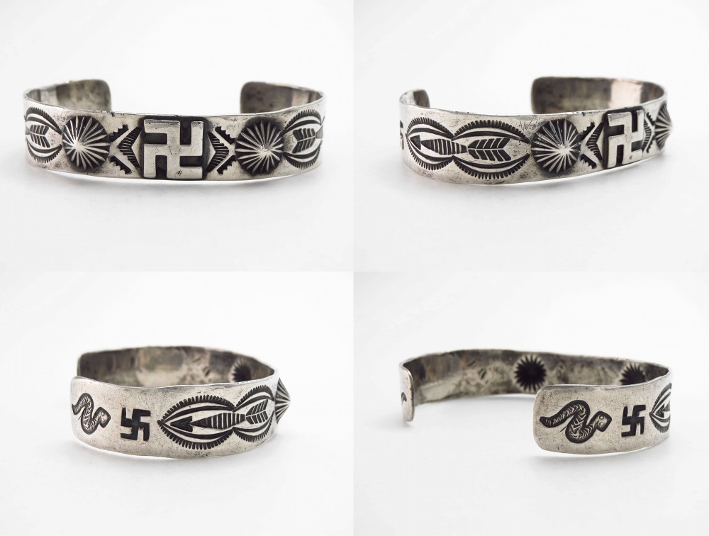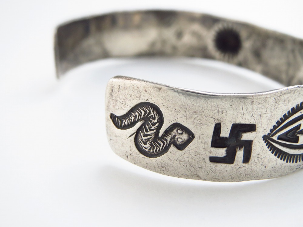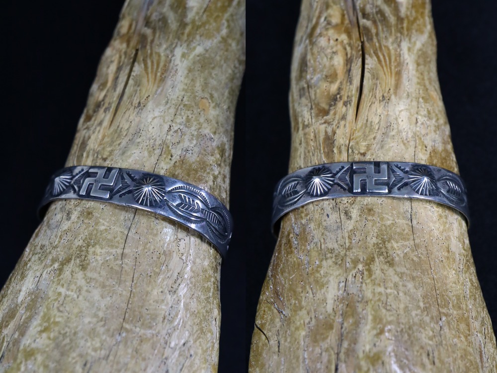 バンド/地金は日本で『平打ち』と呼ばれるシェイプをベースとし、その中央に厚い卍がアップリケされ、それを中心にしてアローやラトルスネーク等のアンティークナバホジュエリーらしいスタンプワークが左右対称に配されています。