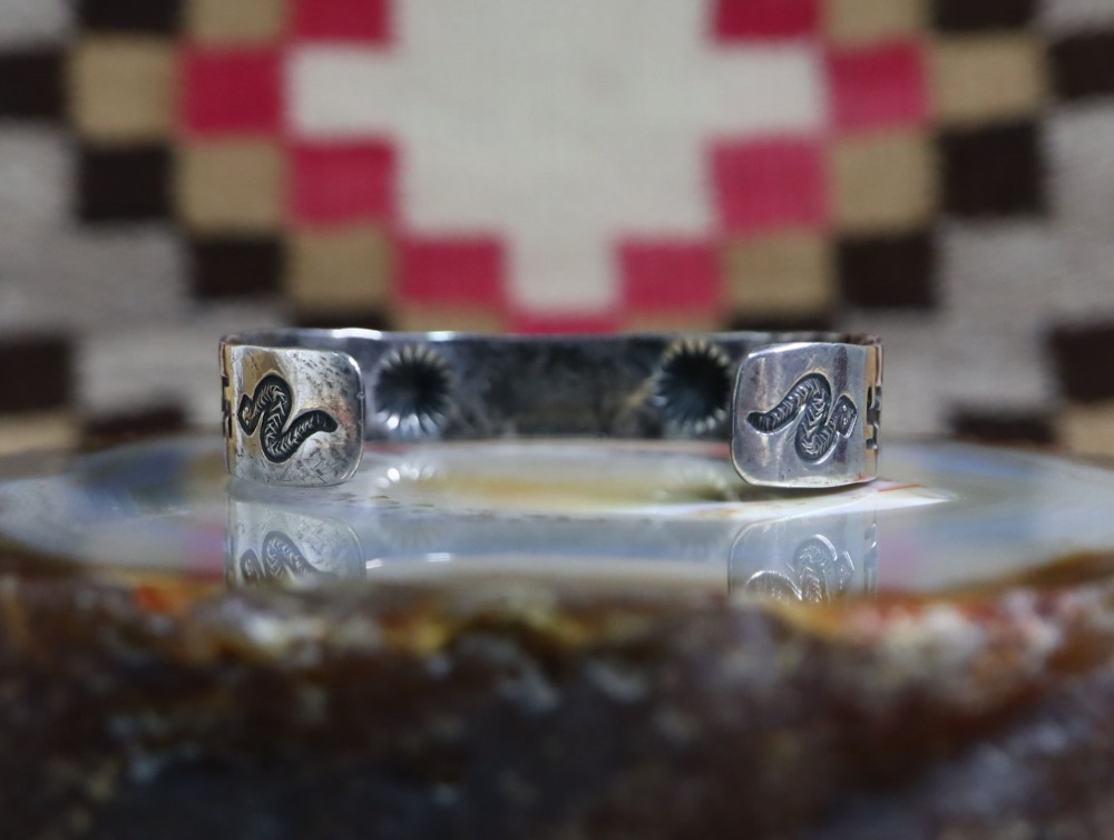 さらに、サイド~ターミナル(両端)にかけても、アローや逆卍、少しリアルなラトルスネークをモチーフとしたデザイン等、ツーリストジュエリーらしくもプリミティブで力強いスタンプワークが刻まれており、大変見所の多いピースとなっています。