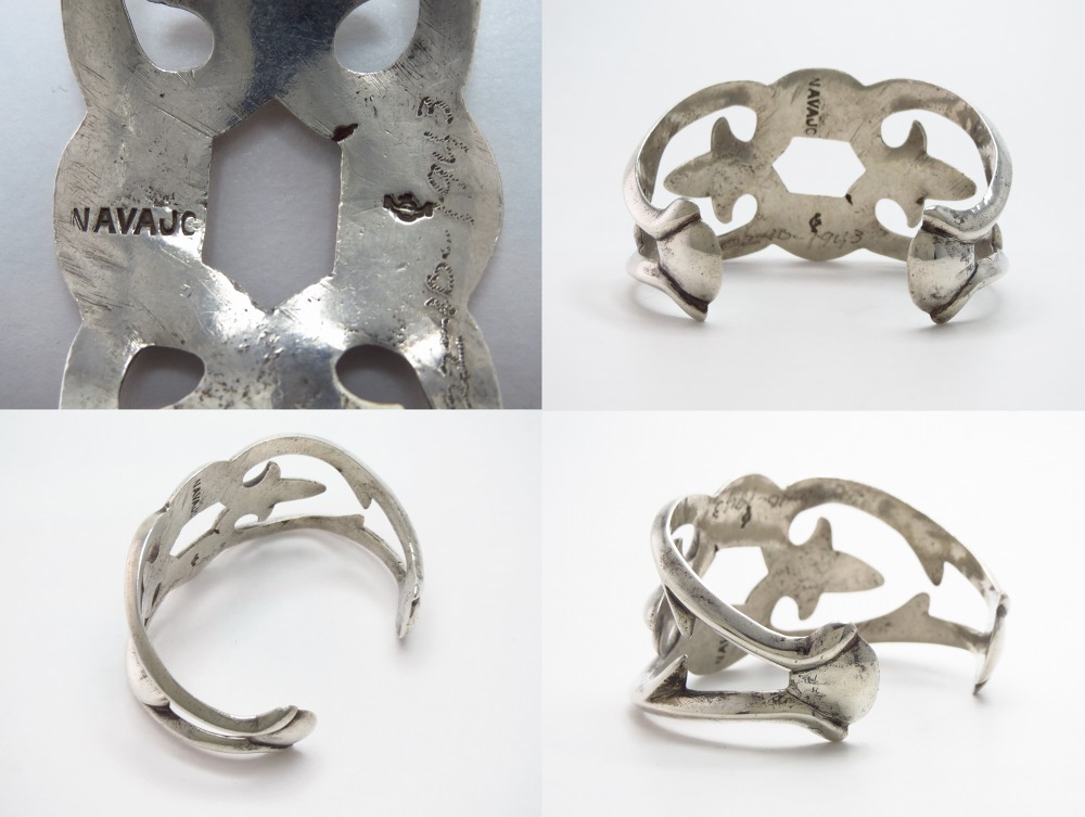 本作の様な『NAVAJO』の文字や、銀含有率92.5%の地金であることを示す『STERLING』の刻印は、1940年代末以降になってから採用された可能性が高く、本作も1940年代末~1950年代に作られた作品と思われます。