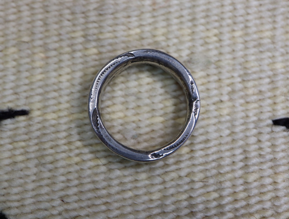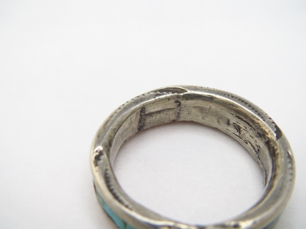 使用感や経年により、コンディションの良い作品ではありませんが、リングを構成するシルバーは、内側と上下の厚みがそれぞれ別々に作られた後にロウ付けされ、堅牢な造形となっています。