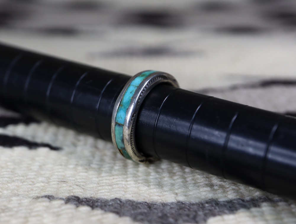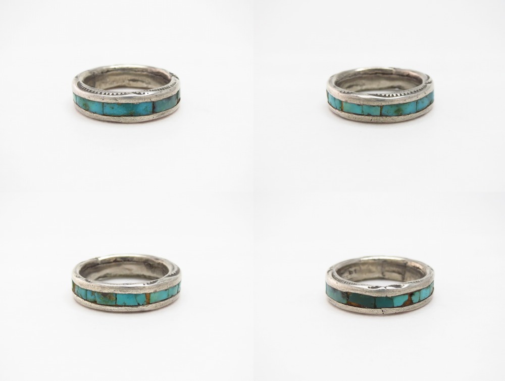 【ZUNI】ズ二のビンテージジュエリー、ズニジュエリーの伝統的な技術であるターコイズインレイをメインに構成しながら、厚みに刻まれたスタンプワークが特徴的なアンティーク/ビンテージリングです。