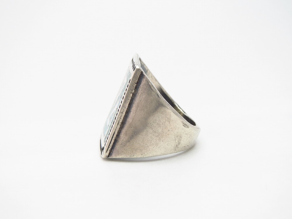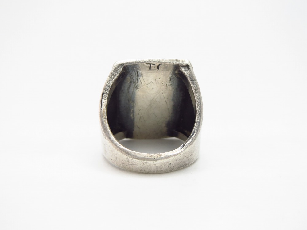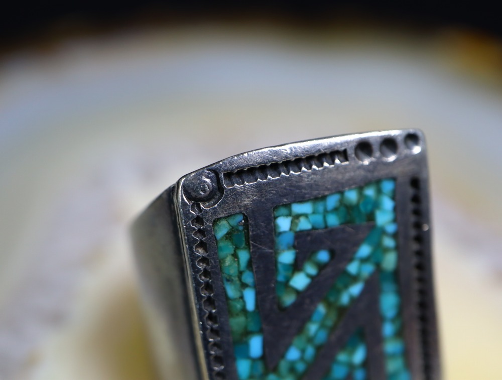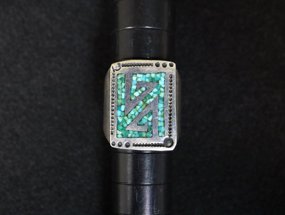 【NAVAJO】ナバホの有名作家【Tommy/Thomas Singer】トミー・シンガー(1938‐2014)による作品。重厚なシルバーワークをベースに『チップインレイ』と呼ばれる破砕した石を樹脂と共にインレイする技術によって構成されたビンテージリングです。