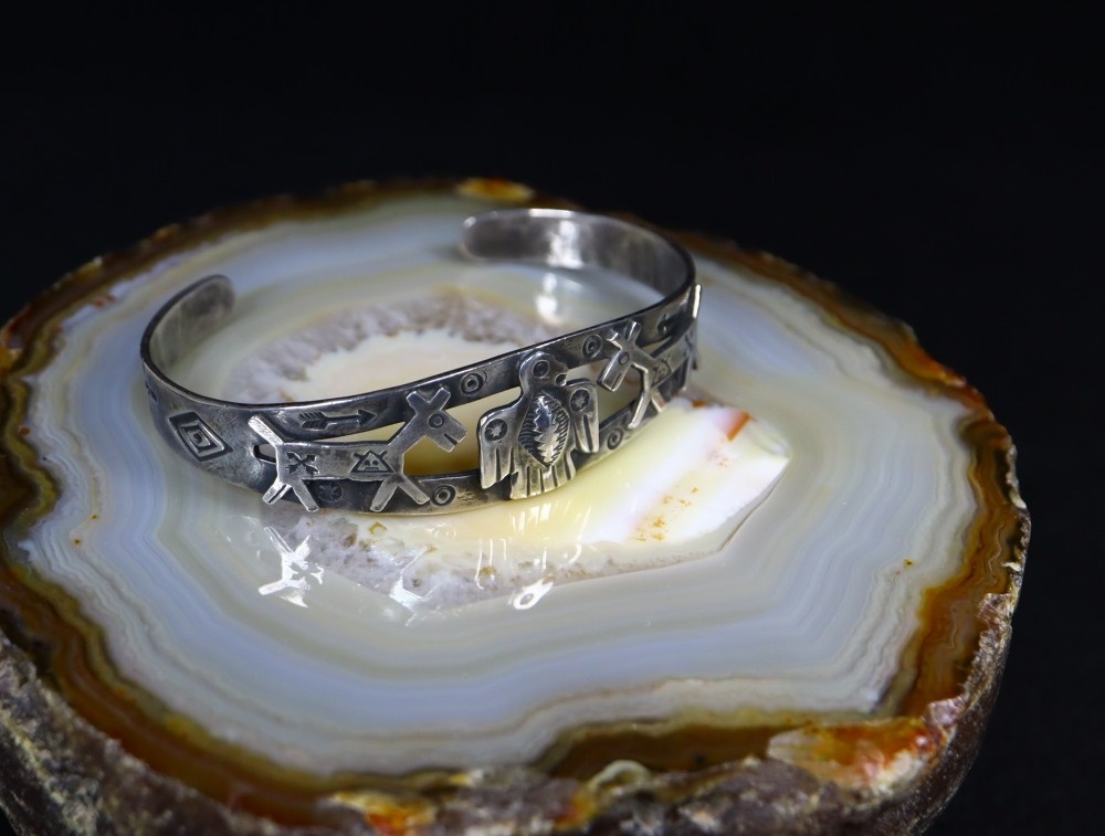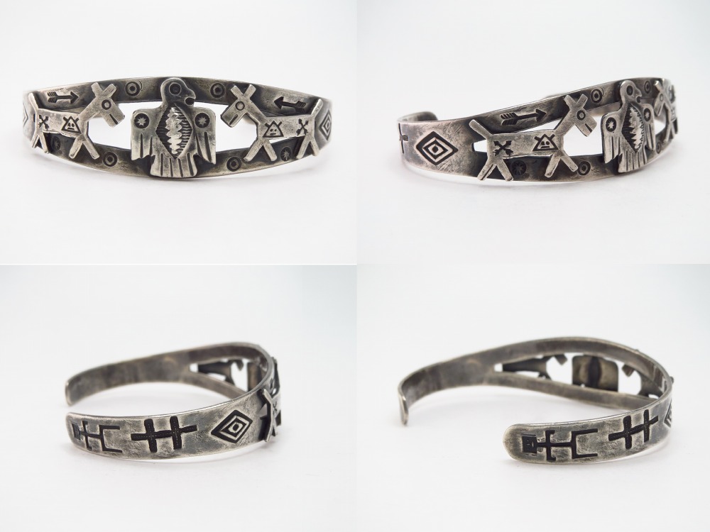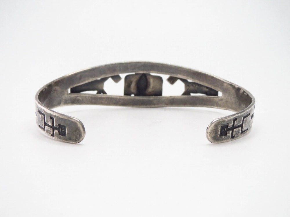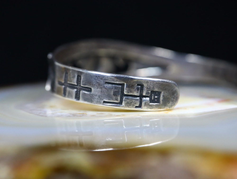 1920年代末頃~1940年代製と思われ、おそらくコインシルバー(銀含有率90.0%)から作られたバンドをベースとしています。