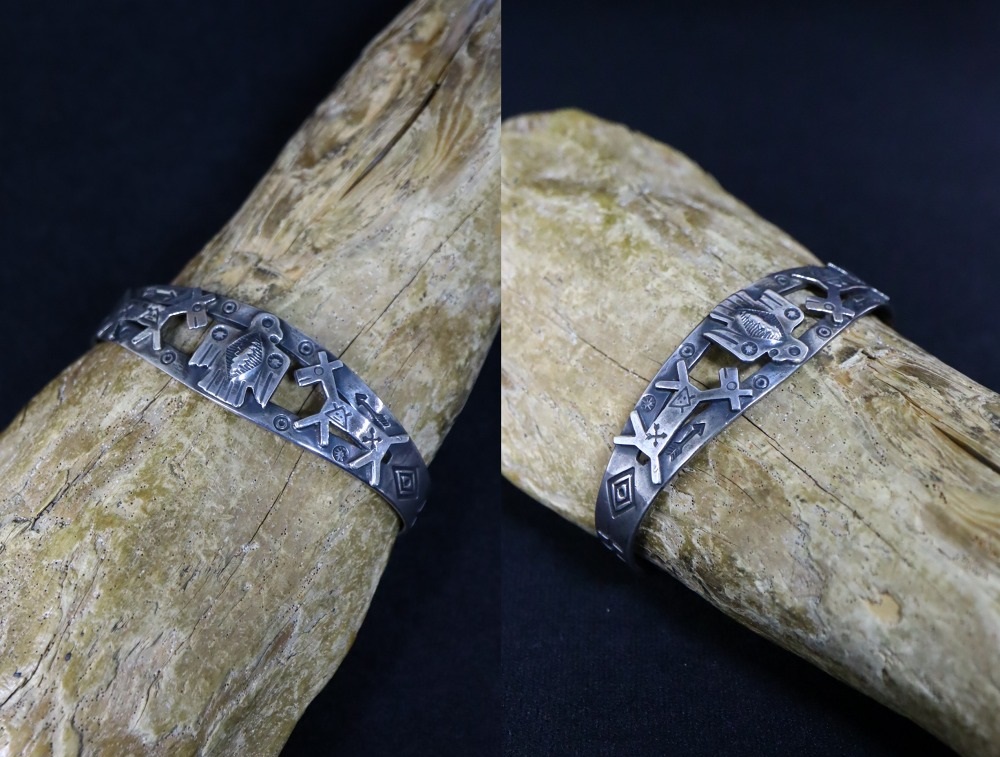 フロント部分が2本に割り開かれた伝統的でオーセンティックなスプリットバンドの造形となっており、そこにツーリストジュエリーやフレッド・ハービースタイルと呼ばれるアイテムを代表する、サンダーバードとホース/馬モチーフのアップリケをメインに構成されています。