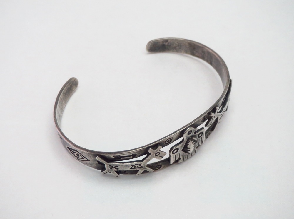 【Fred Harvey Style】フレッド・ハービースタイルや【Tourist Jewelry】ツーリストジュエリーと呼ばれる、20世紀前半頃にアメリカ中西部の観光客向けにスーベニアアイテム(土産物)の一つとして作られたアンティーク/ビンテージバングルです。