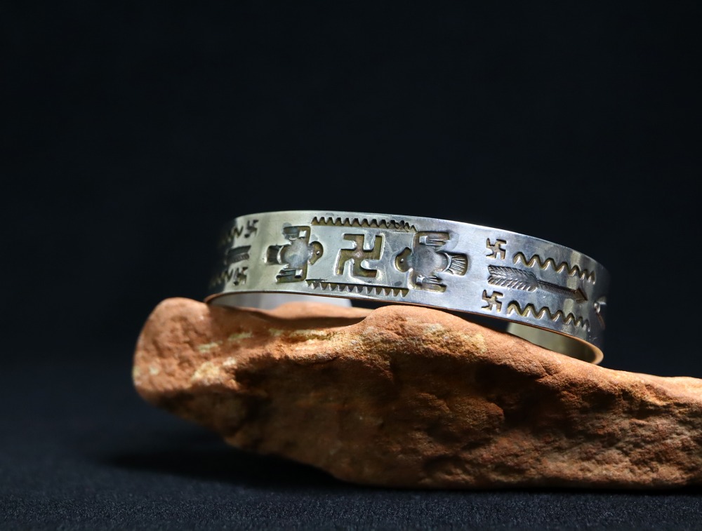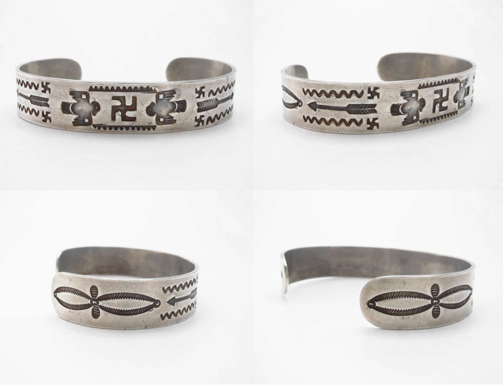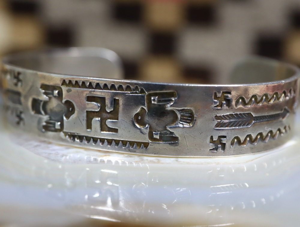 【NAVAJO】ナバホのアンティークジュエリー、【卍】Whirling Log/Nohokosやサンダーバード、アロー等のスタンプワークが刻まれた作品で、大変貴重な初期ツーリストジュエリーのアンティーク/ビンテージバングルです。