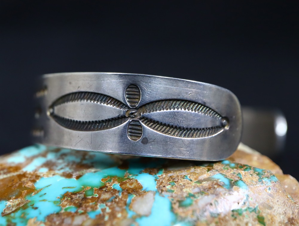センターには卍、そしてその両脇にはサンダーバードが刻まれ、サイド~ターミナル(両端)にかけてもアロー等のナバホジュエリーらしくプリミティブで大変魅力的なスタンプワークが施されています。