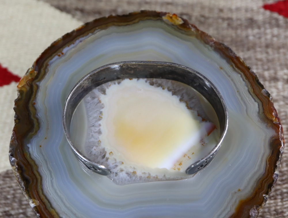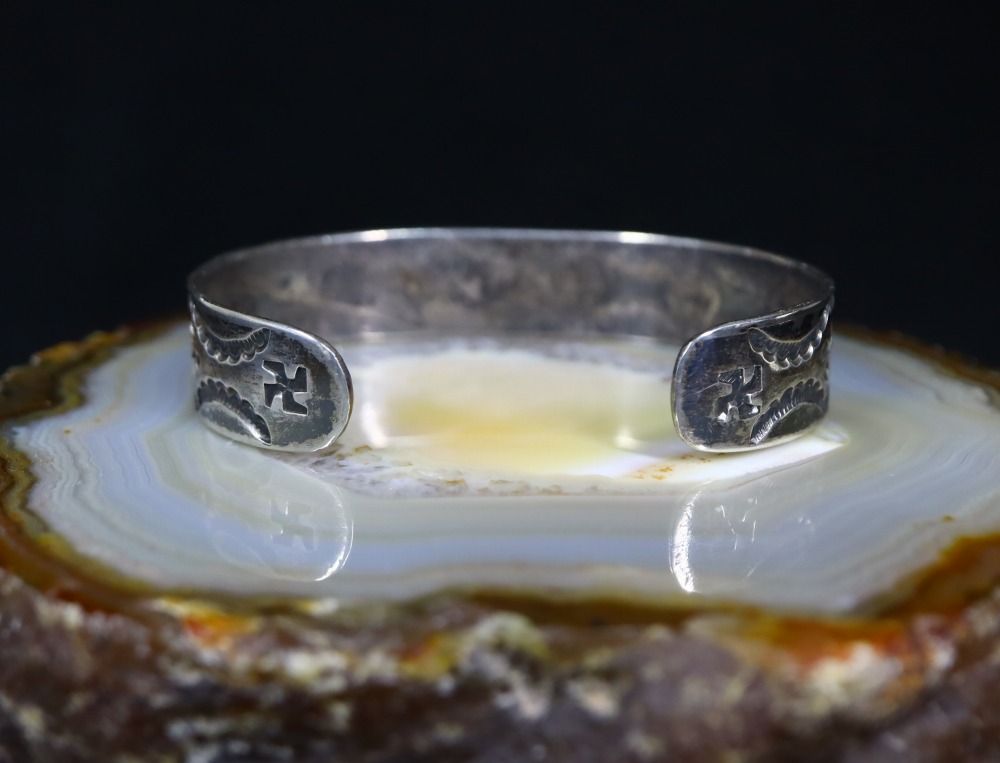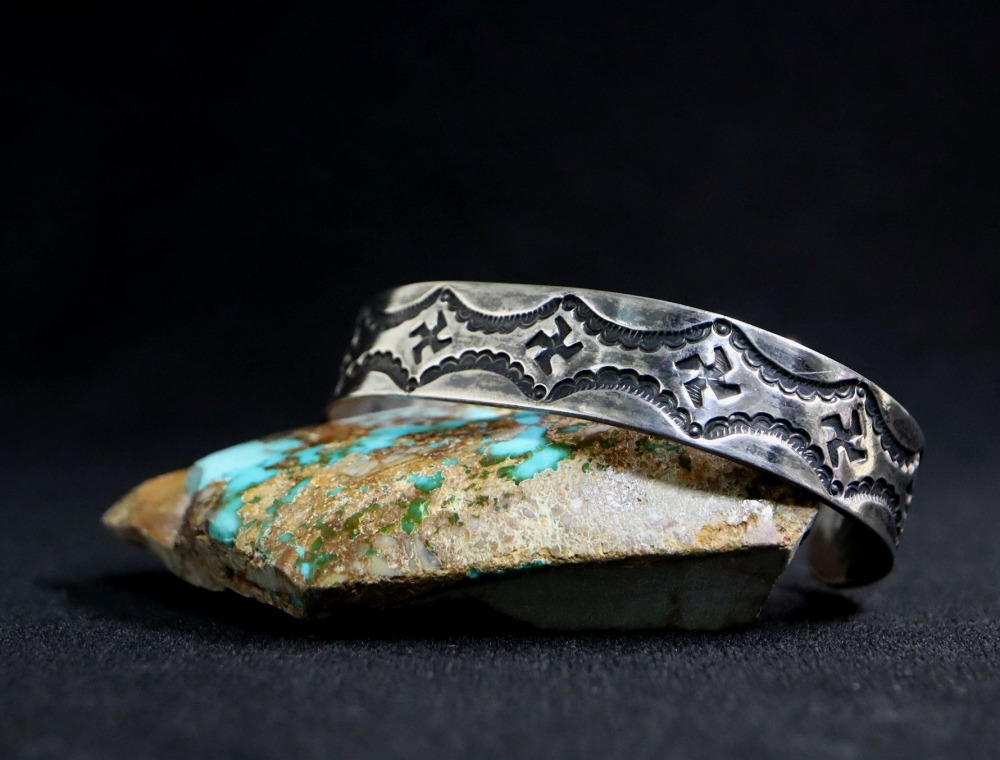 1920年代中頃~1930年代頃に作られた作品で、おそらくインゴットシルバー(銀塊)から成形されたバンド/地金をベースとし、ナバホジュエリーとしては少し珍しい連続性を重視したデザインの作品となっています。