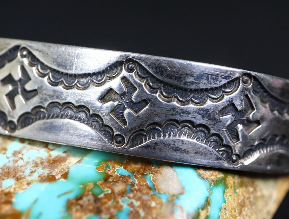 本作では非常に細かく繊細な文様を持ったスタンプ(鏨)が正確に深く打ち込まれており、ナバホジュエリーの伝統的なシルバーワークと造形スタイルで構成された作品ですが、作者の非常に高い技術とクリエイティビティも感じられます。