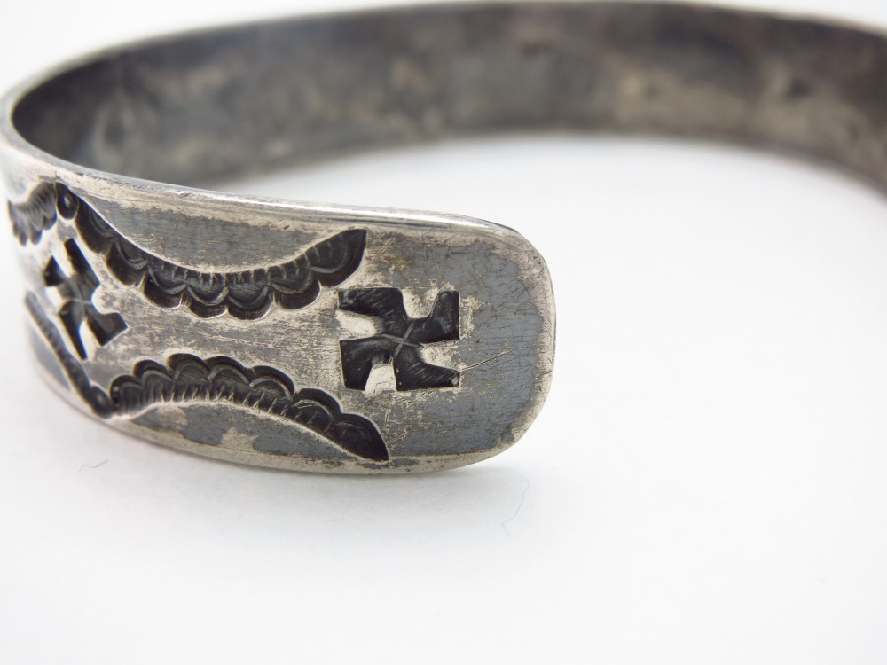 【NAVAJO】ナバホのアンティークジュエリー、【卍】Whirling Log/Nohokosのスタンプワークが連続して施されたアンティーク/ビンテージバングルです。