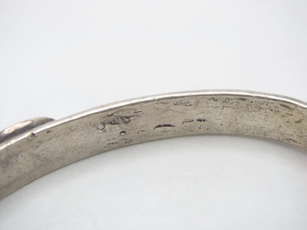 また、本作ではトライアングルワイヤー上下のエッジをフラットに削り鞣した仕上げが施されており、このようなディテールも古いトライアングルワイヤーバングルに多く見られ、アンティーク作品独特のシェイプを生み出す要因となっています。