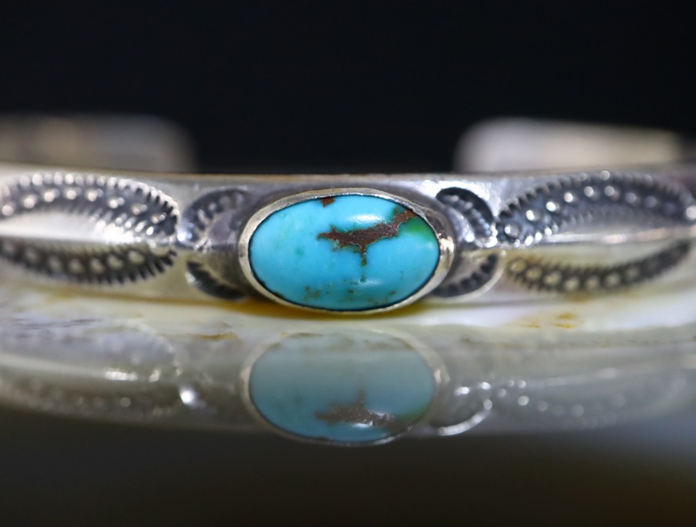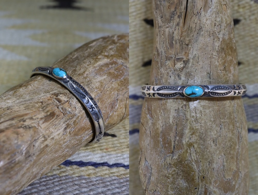 アーリーナバホジュエリー特有の独特なシェイプを持つトライアングルワイヤーをバンド/地金に構成し、センターにターコイズをマウントした貴重な作品。ナローなバンドのバングルにおいてはでとても珍しいメンズ向けの大きいサイズも希少なピースとなっています。