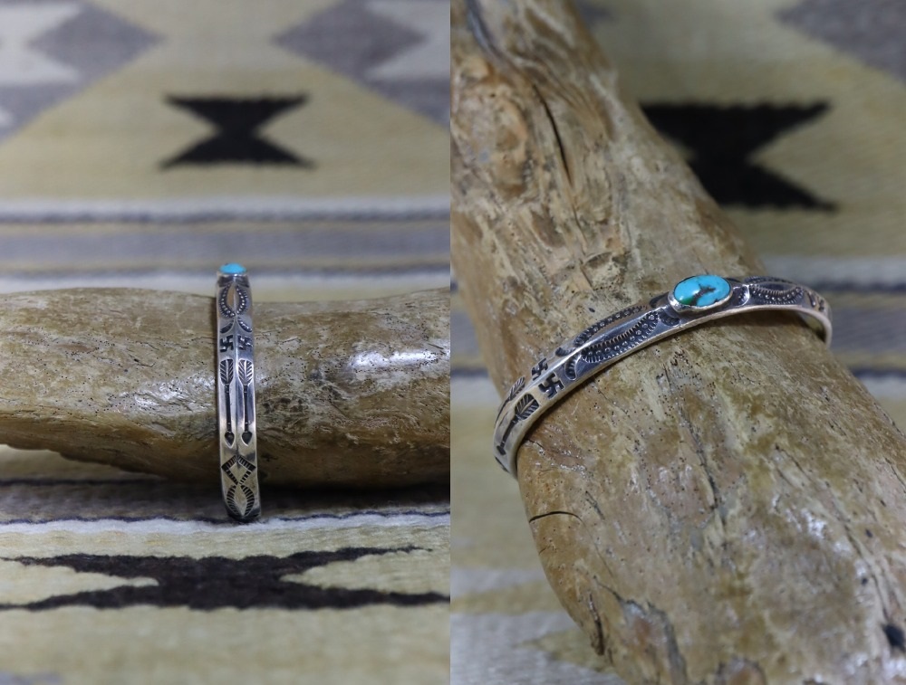 両サイドには逆卍やアローのモチーフ等が刻まれ、プリミティブで大変魅力的なスタンプワークが施されることで、アンティークナバホジュエリーらしく武骨でエスニシティな魅力を放っています。