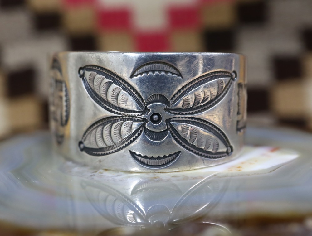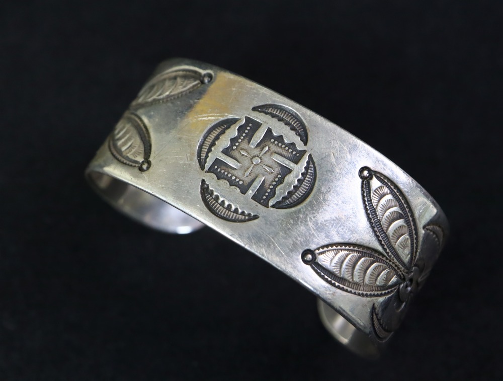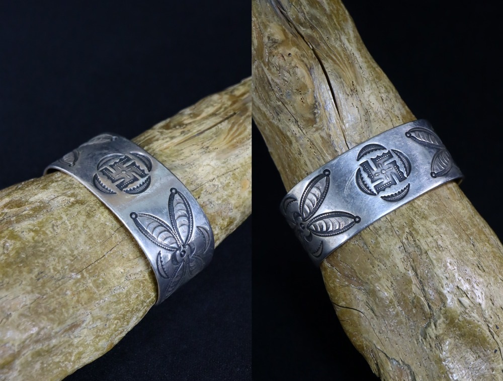 【NAVAJO】ナバホのアンティークジュエリー、インゴットシルバー(銀塊)から成形された重厚でワイドなバンドをベースに【卍】Whirling Log/Nohokosやバタフライモチーフと思われる質の高いスタンプワークが施された非常に貴重なアンティーク/ビンテージバングルです。