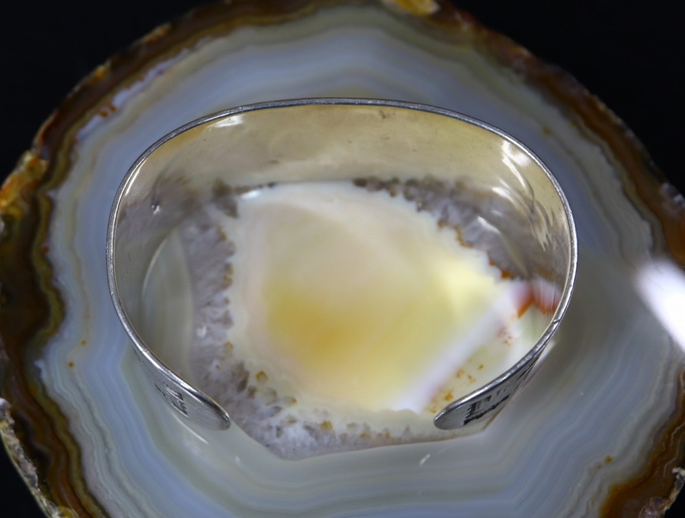 1910年代末頃~1930年代前半頃に作られたと思われる作品で、インゴットシルバー(銀塊)から成形されたバンドは、日本において『平打ち』と呼ばれるスタイルに造形されており、上下のエッジは少し丸く鞣されています。