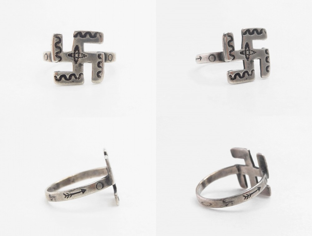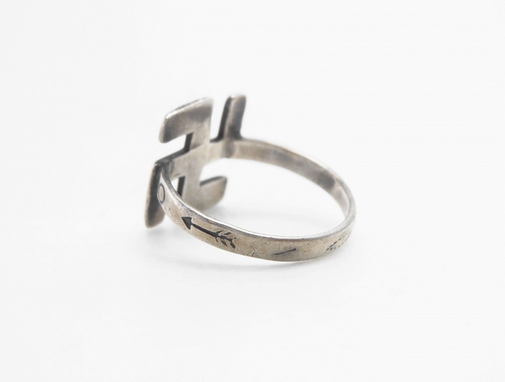 1920年代後半~1930年代に作られた個体で、アロー等のモチーフが刻印されたナローなフラットワイヤーによるシャンク/地金をベースに、逆卍のフェイスが構成された作品です。