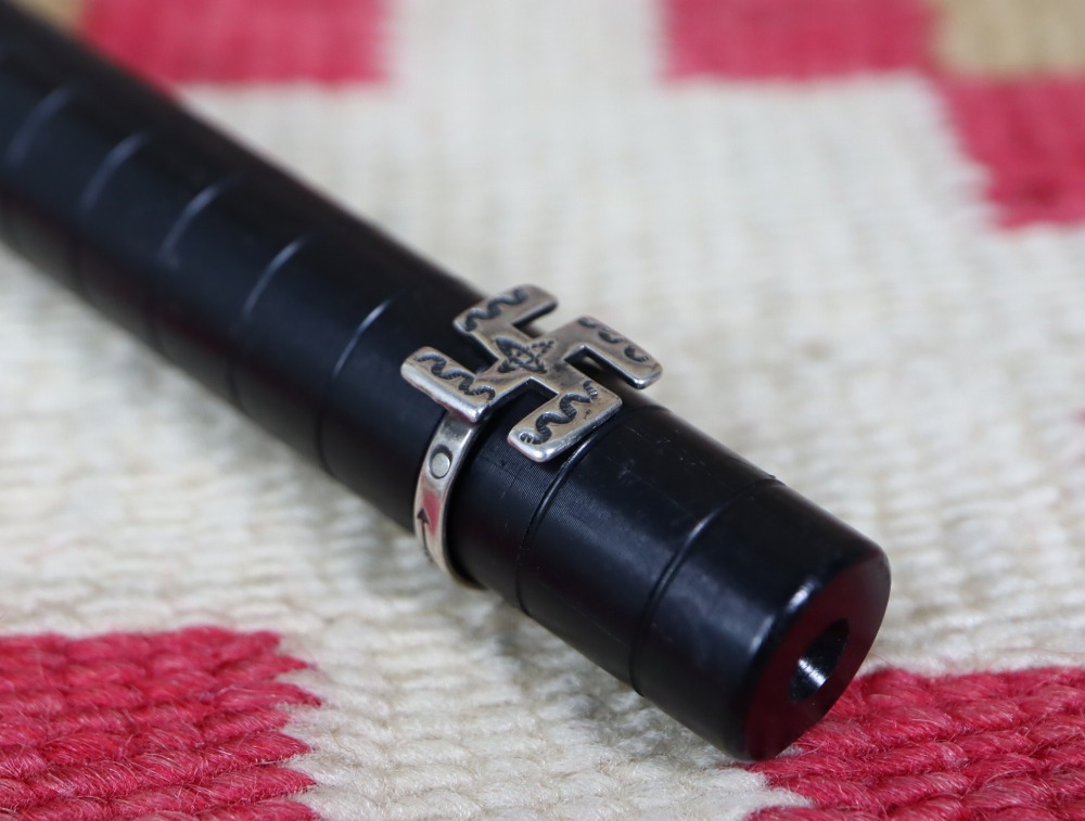 プリミティブな技術やクラシックなシェイプ、荒々しいスタンプ/刻印によってアンティークインディアンジュエリーらしい重厚な表情を持ちながら、ツーリストジュエリーらしいアイコニックなモチーフによって独特の雰囲気も兼ね備えた作品です。