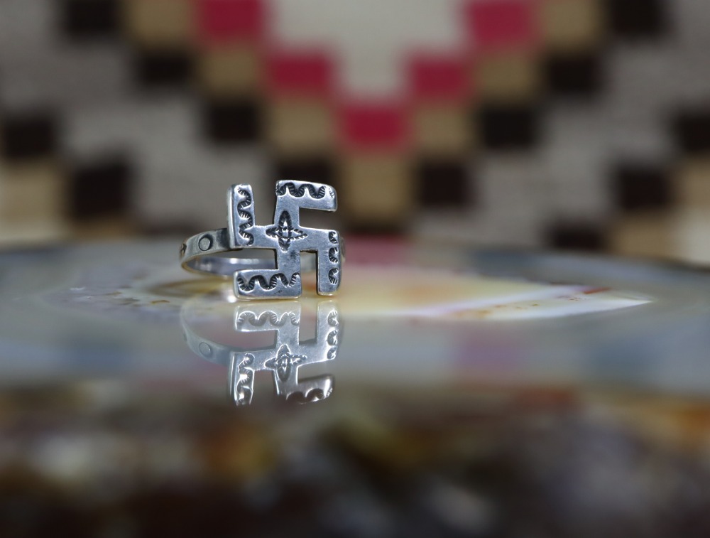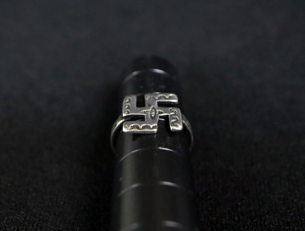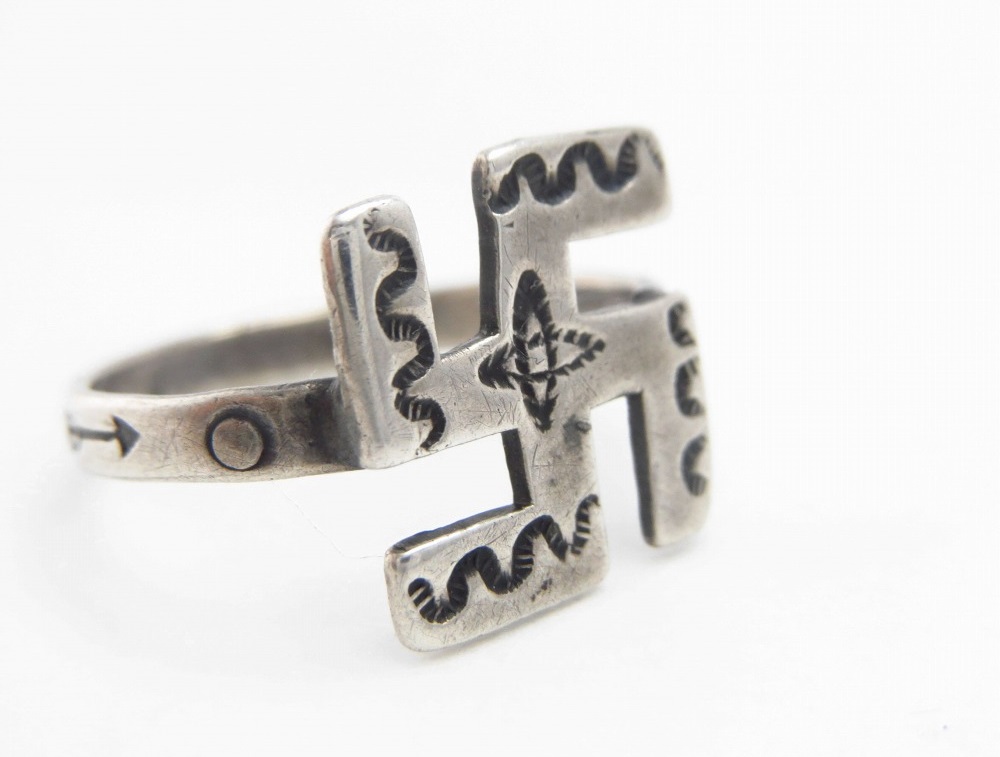 【NAVAJO】ナバホのアンティークジュエリー、プリミティブなスタンプワークの刻まれた【逆卍】Whirling Log/Nohokosシェイプのフェイスが大変魅力的な小さいサイズのアンティーク/ビンテージリングです。