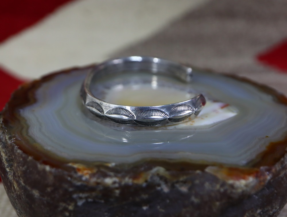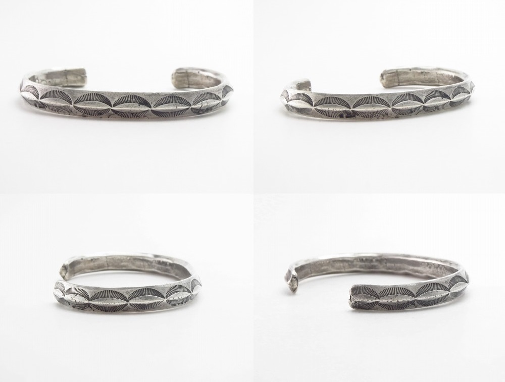 単一のスタンプツール(鏨・刻印)が連続して刻印されたプリミティブでシンプルなスタンプワークですが、作者によってハンドメイドされたスタンプツールのクオリティにより細かな文様が刻み込まれ、武骨なブレスレットに上質感や複雑な表情を与えているようです。
