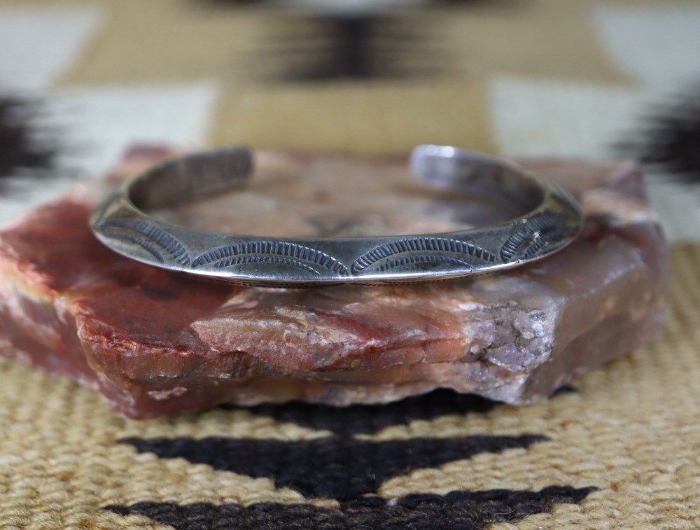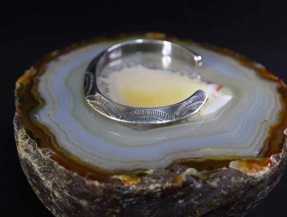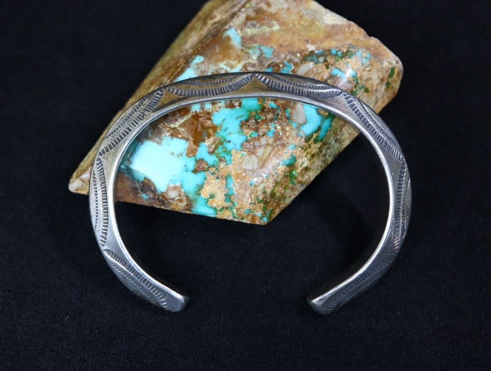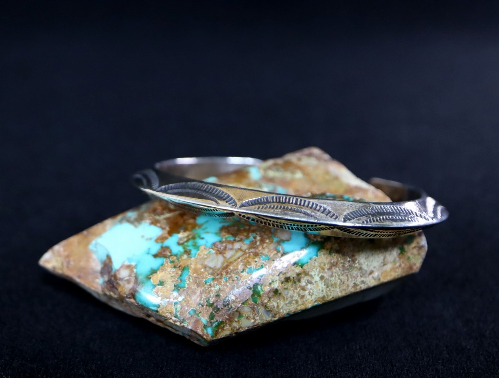 さらに、その硬さや滑らかなシルバーの質感はインゴットシルバーから成形された作品独特であり、アンティークナバホジュエリーの魅力的な特徴となっています。
