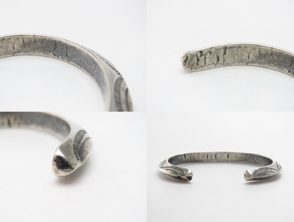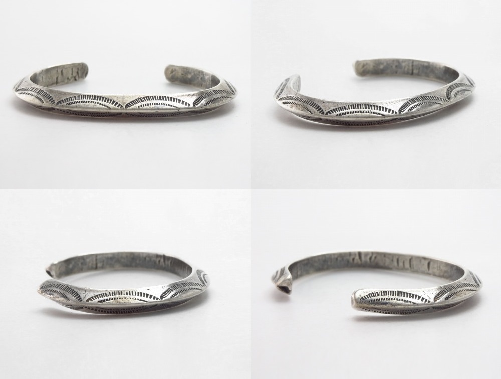 プリミティブな製法と、古典期から続く伝統を継承する造形スタイルの作品であり、その製法や力強いスタンプワークによって、ビンテージインディアンジュエリーらしい武骨な雰囲気と、現代においても洗練された印象も受ける、練り上げられたアンティーク工芸品としての佇まいや独特の迫力を宿しています。
